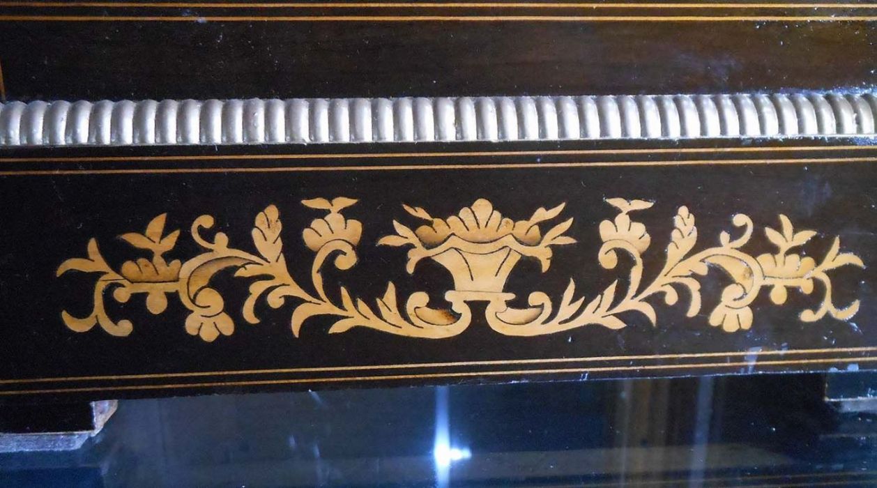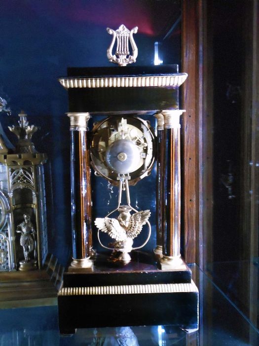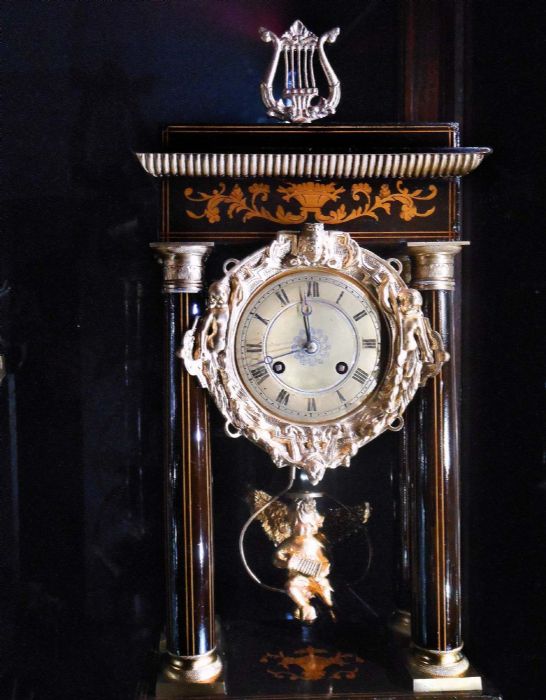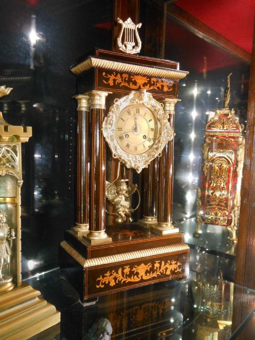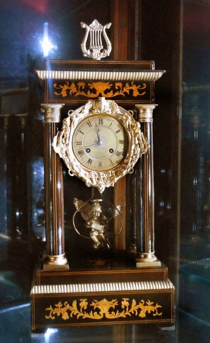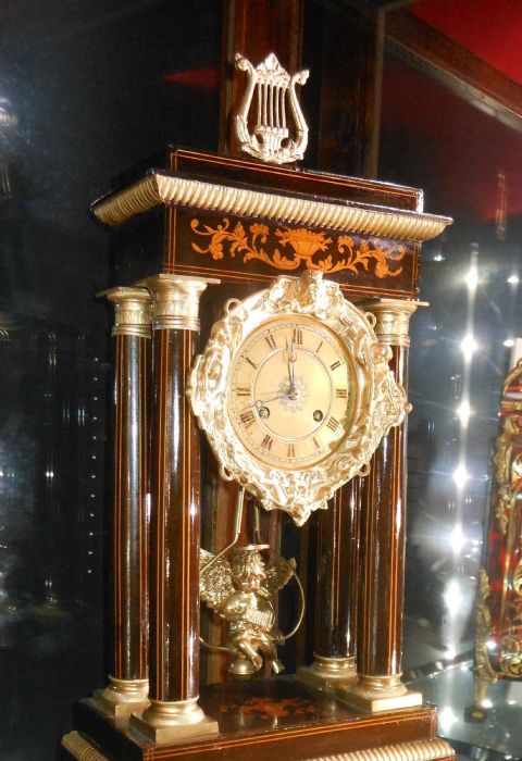 Tipico orologio a portico in legno di palissandro con tarsie in bosso. Di particolare interesse è la pendola a "doppio elemento" che forma in realtà un dondolo per l'angioletto.
