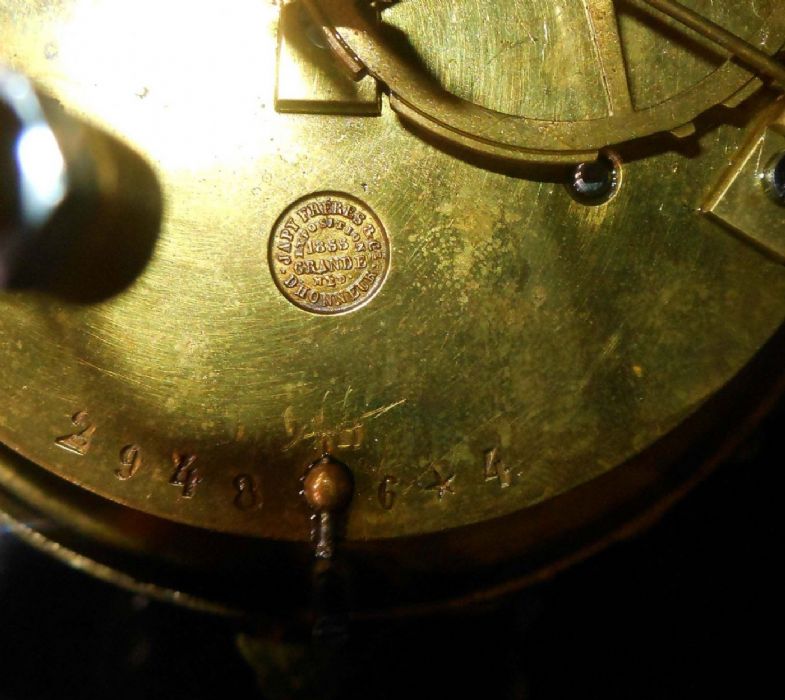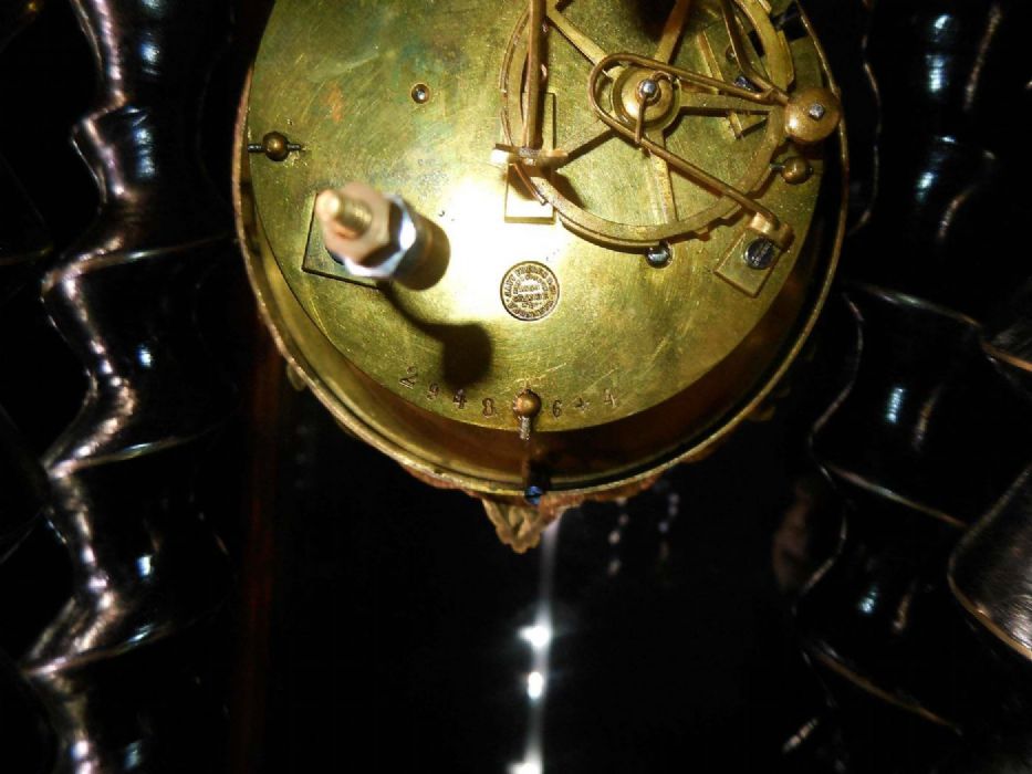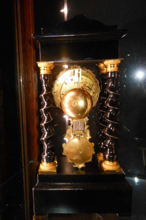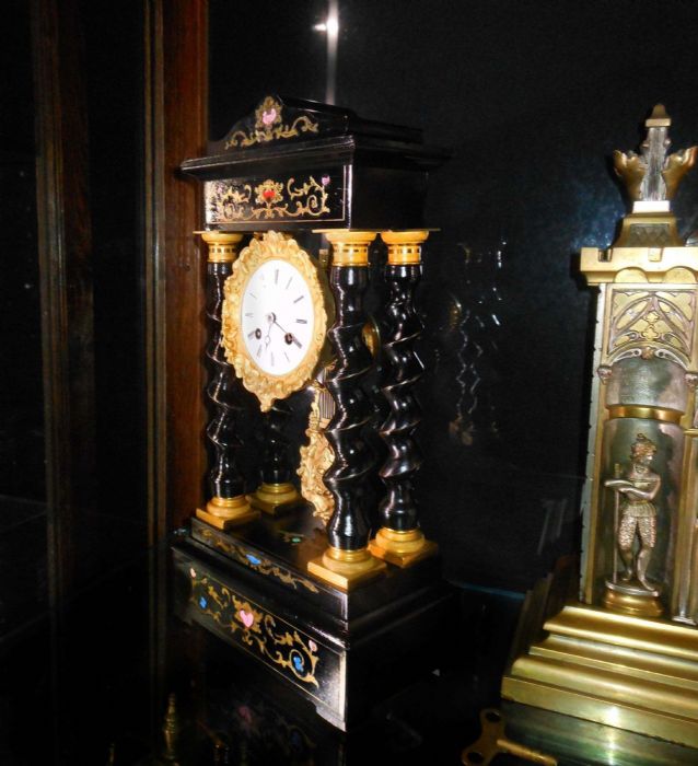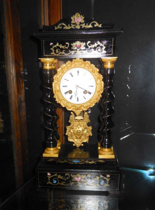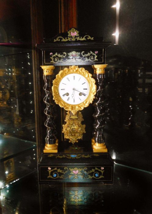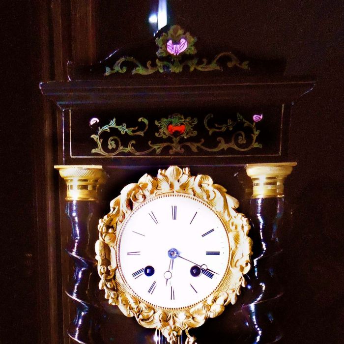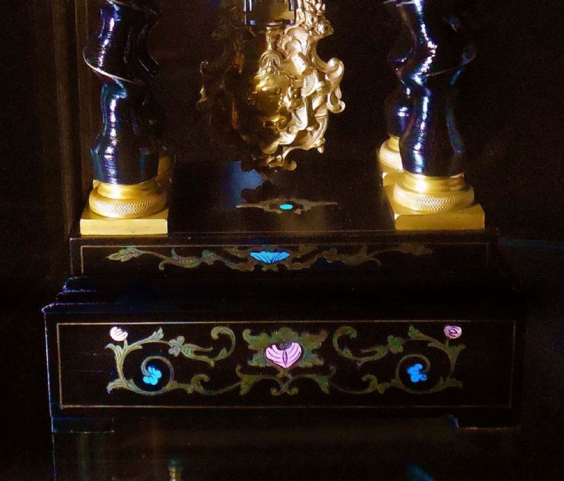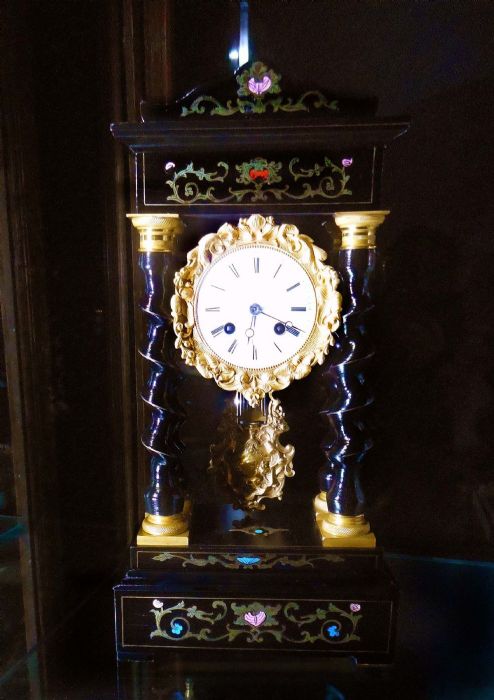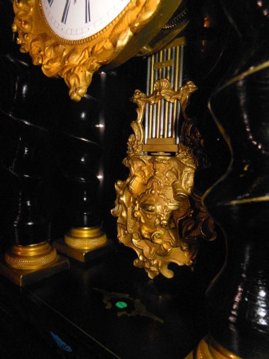 Bell'orologio in legno ebanizzato con tarsie eseguite a "marchettature" ( per marchettatura si intende una lavorazione con rame dorato e dipinto. Uno specialista di questa tipologia di lavorazione era Charles Boulle).