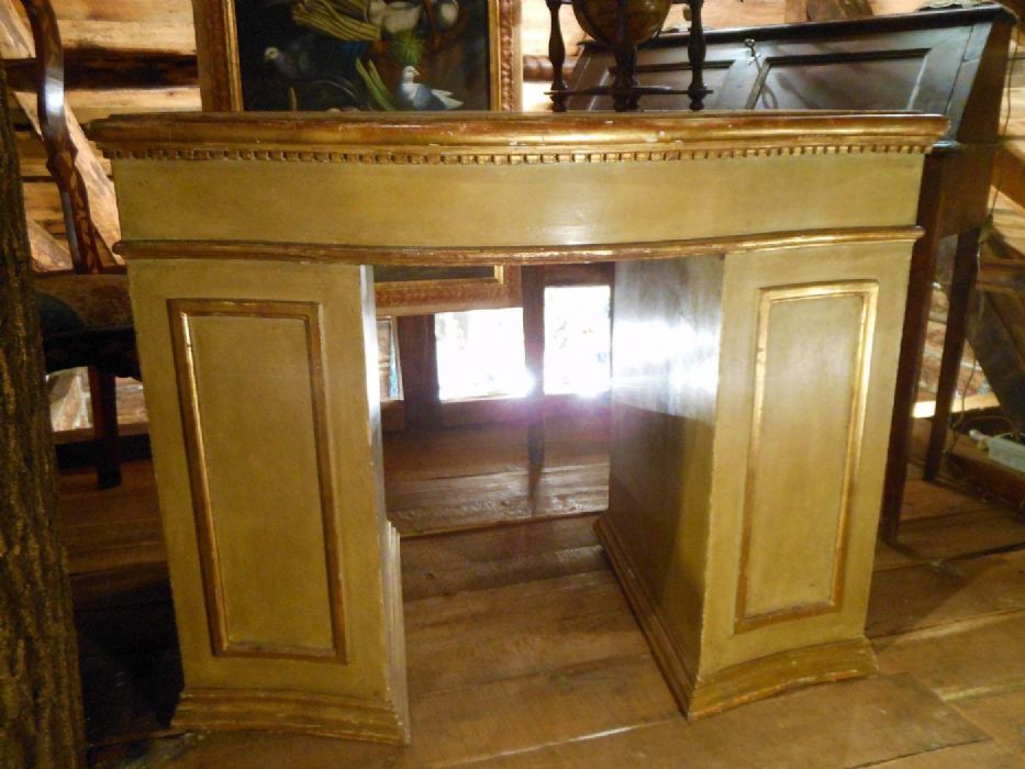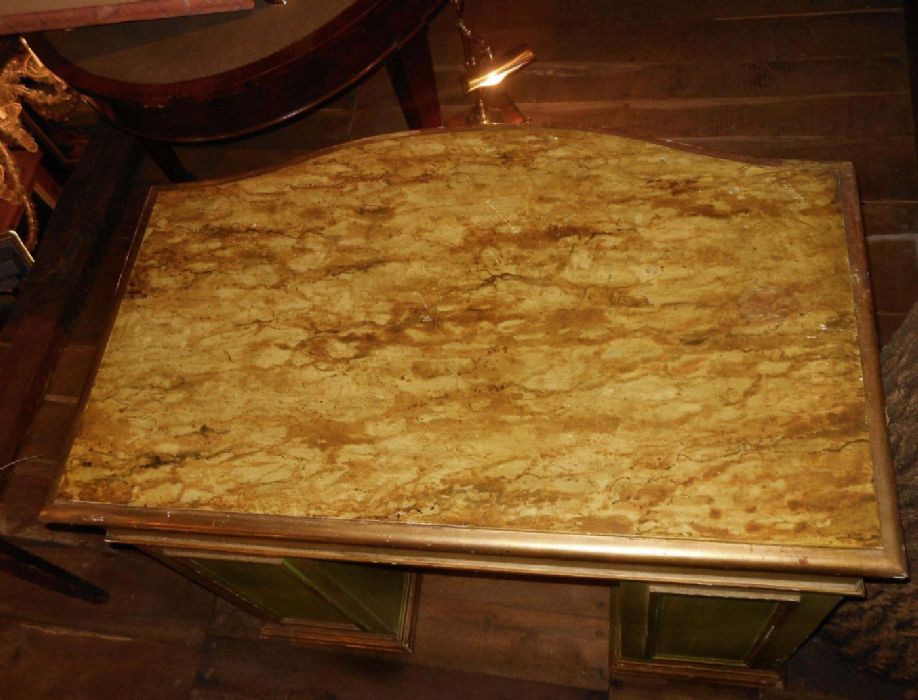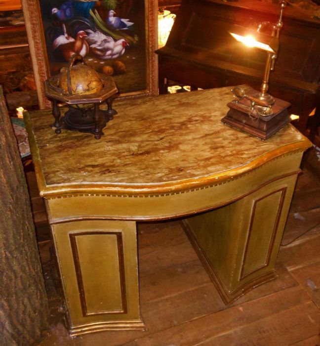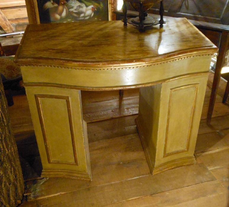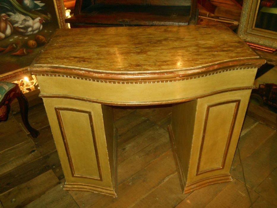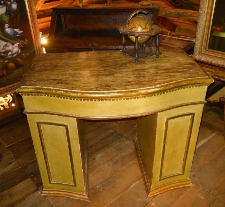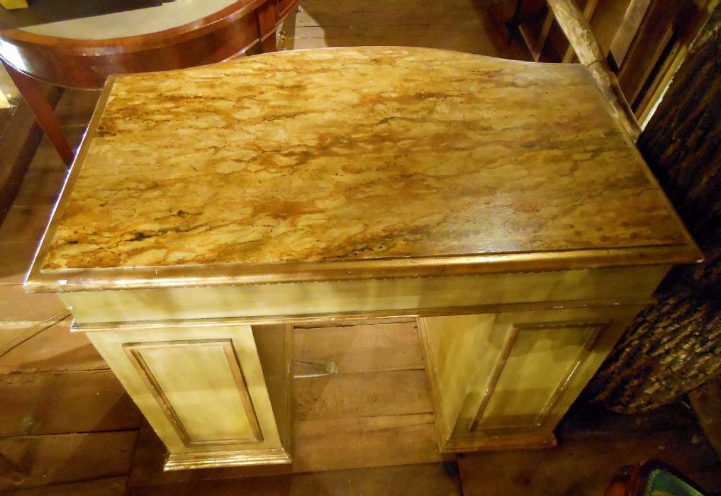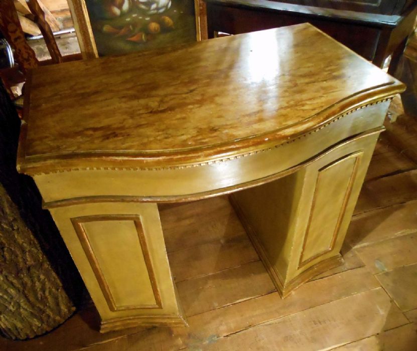 Scrivania faentina di fine Ottocento in legno dolce laccata, dorata con piano dipinto in finto marmo (come in uso nel periodo Neo-Classico).