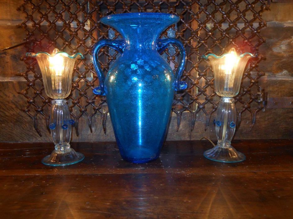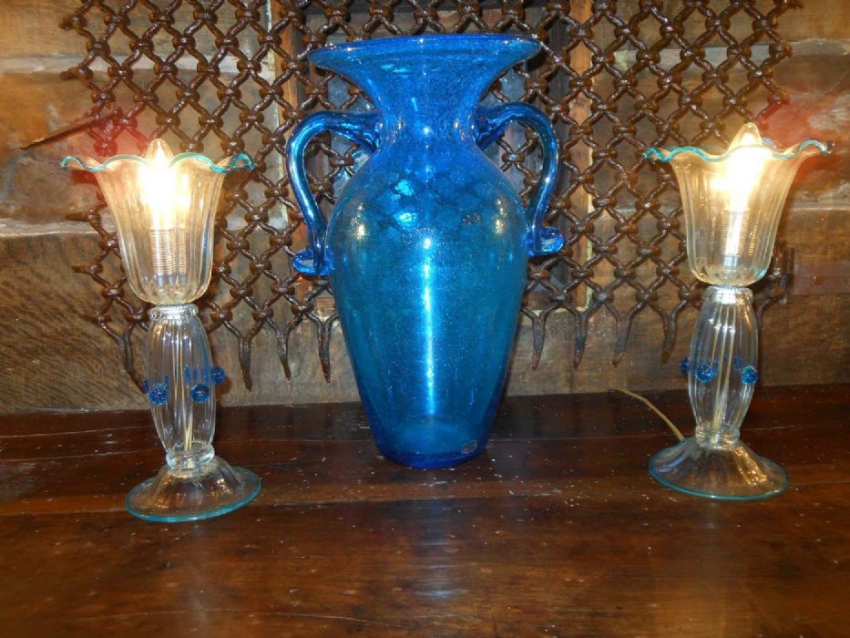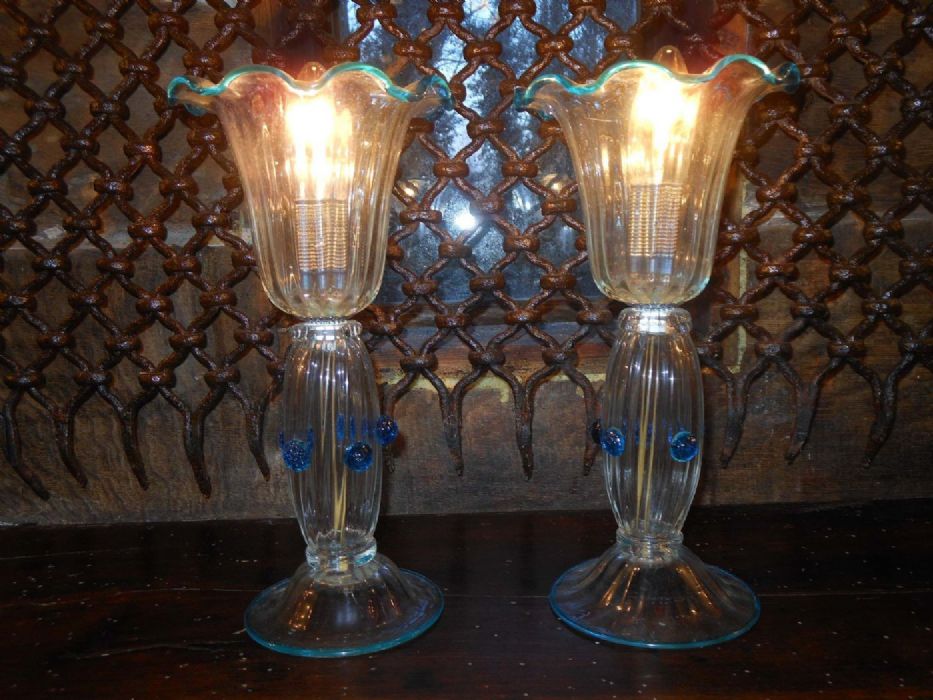 Coppia di lumette in vetro di Murano soffiate e tirate a pinza con lavorazione a " filo"sulla tonalità del celeste.