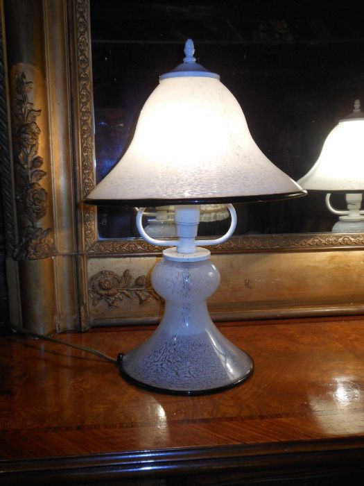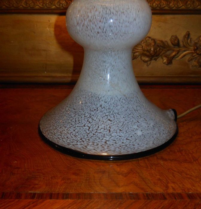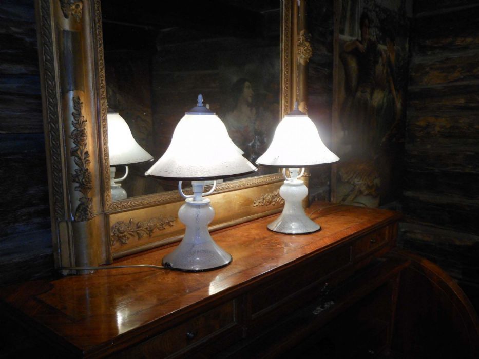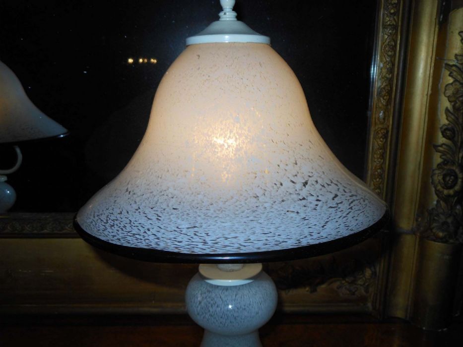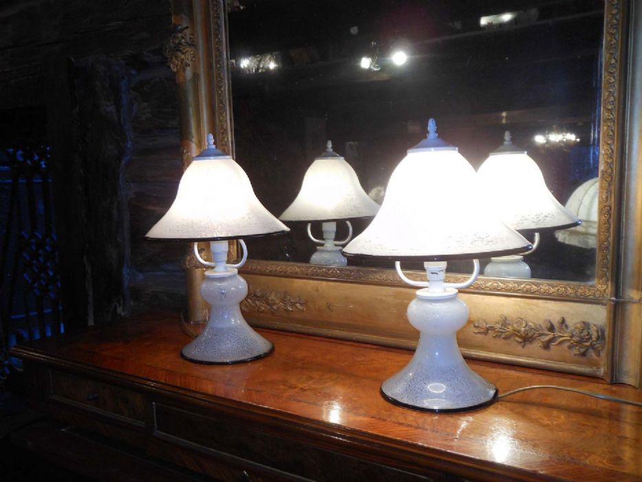 Coppia di lumette in vetro di Murano soffiate e tirate a pinza con lavorazione a " filo" nero e intrusione tipo "lattimo".