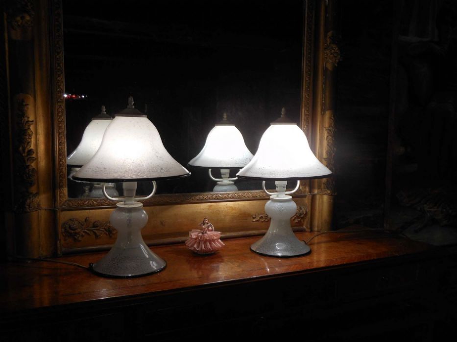 Coppia di lumette in vetro di Murano soffiate e tirate a pinza con lavorazione a " filo" nero e intrusione tipo "lattimo".