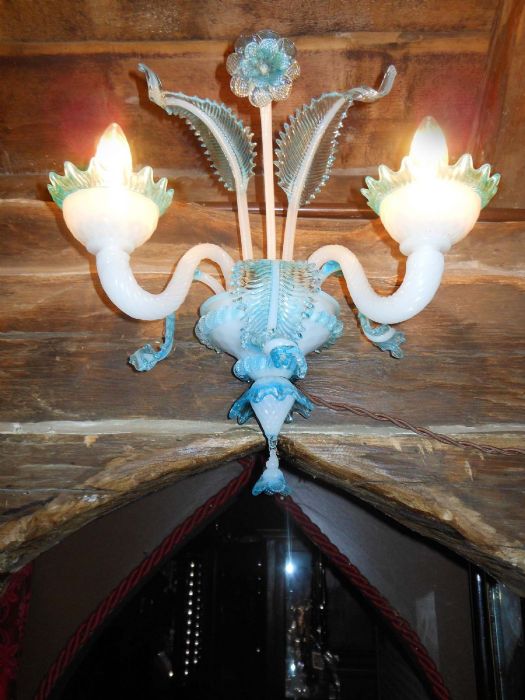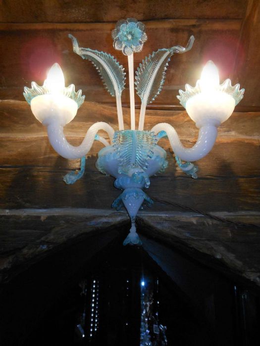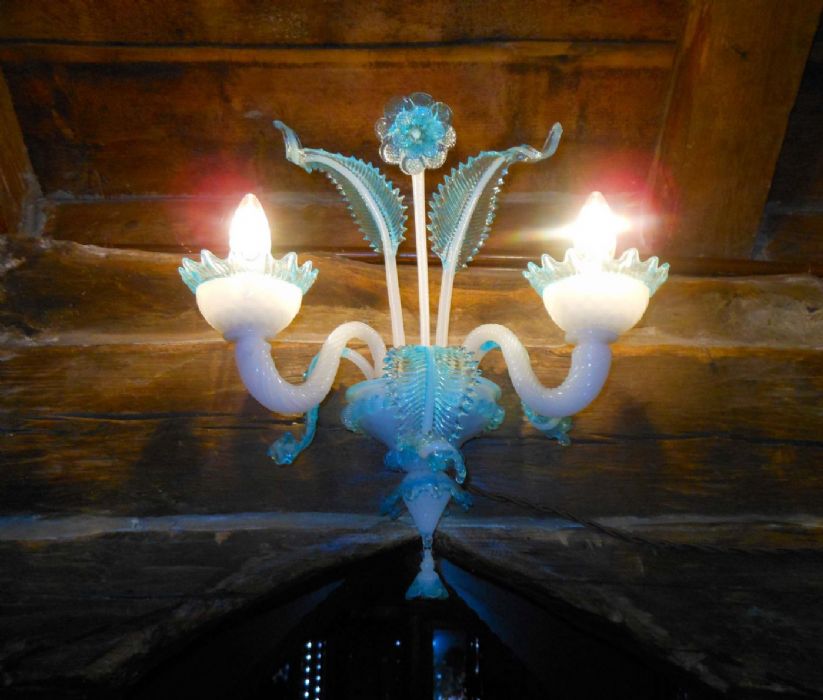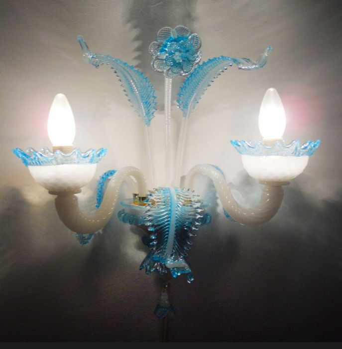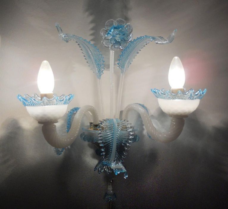 Applique di Murano a due luci con la rara colorazione opalino bordata di azzurro cielo con foglie torchon e fiore in pasta vitrea azzurro.