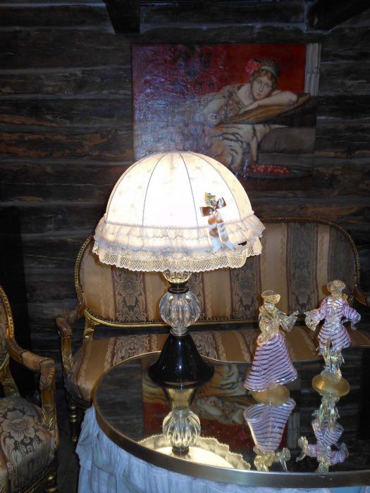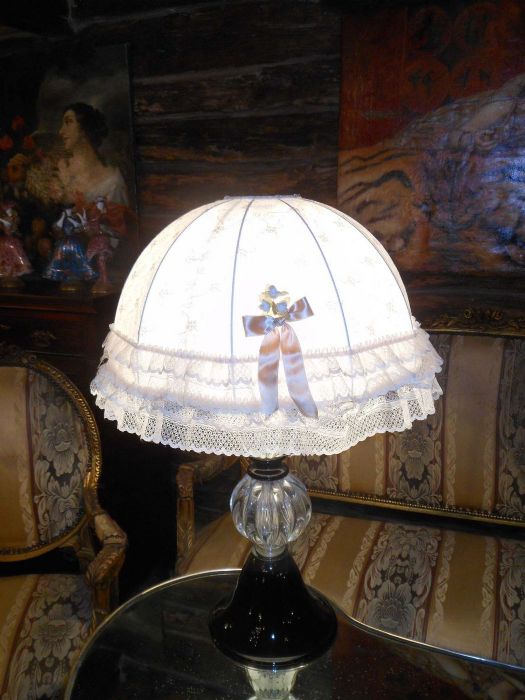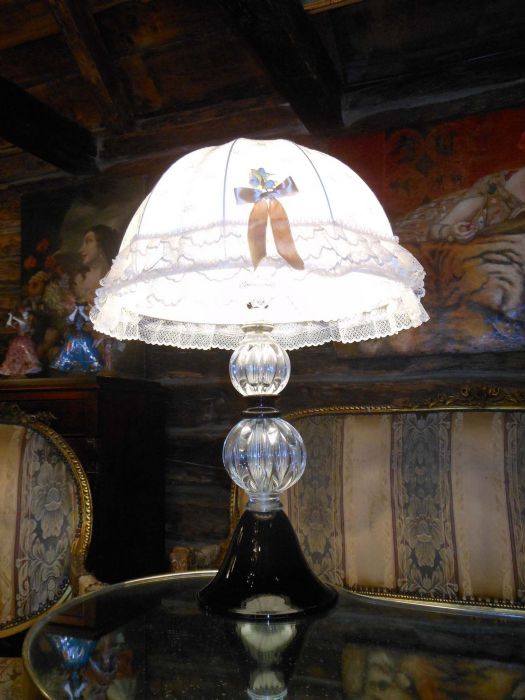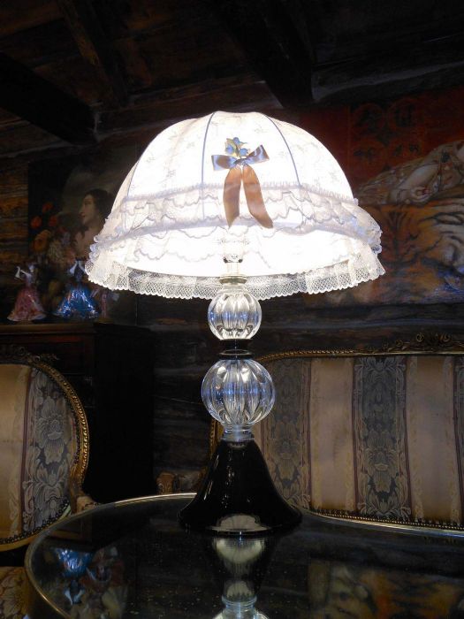 Soffiata e tirata a pinza, con paralume di stoffa e pizzi.