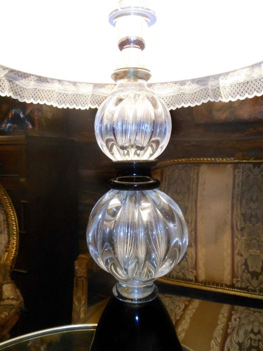 Deliziosa lampada da tavolo del periodo "futurista" con lavorazione "a bala", cioè un susseguirsi di forme rotondeggianti e coniche dove si alternano il vetro cristallino e il "nero hyalit" creando un insieme molto armonico. Tipico del periodo "futurista", quando Carlo Scarpa e Giò Ponti disegnarono lampadari e oggetti per le vecchie fornaci muranesi.