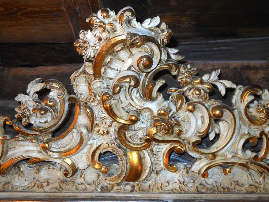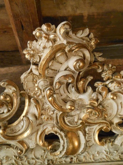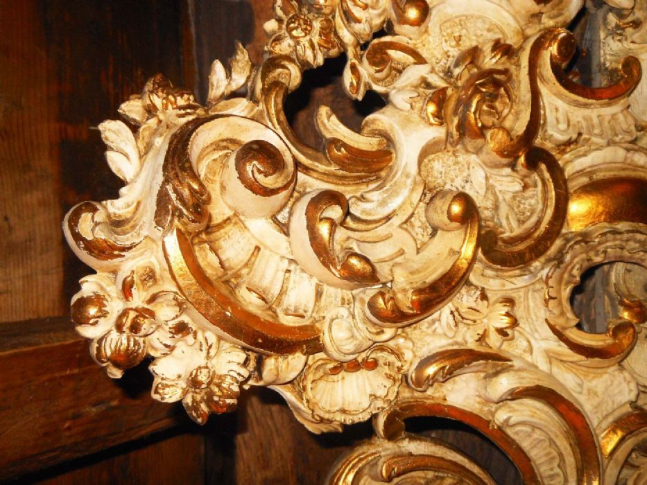 I racemi che adornano questa bella specchiera sono particolarmente raffinati e di tonalità con tinte pastello e dorature a foglia che ne evidenziano le volute.