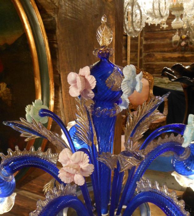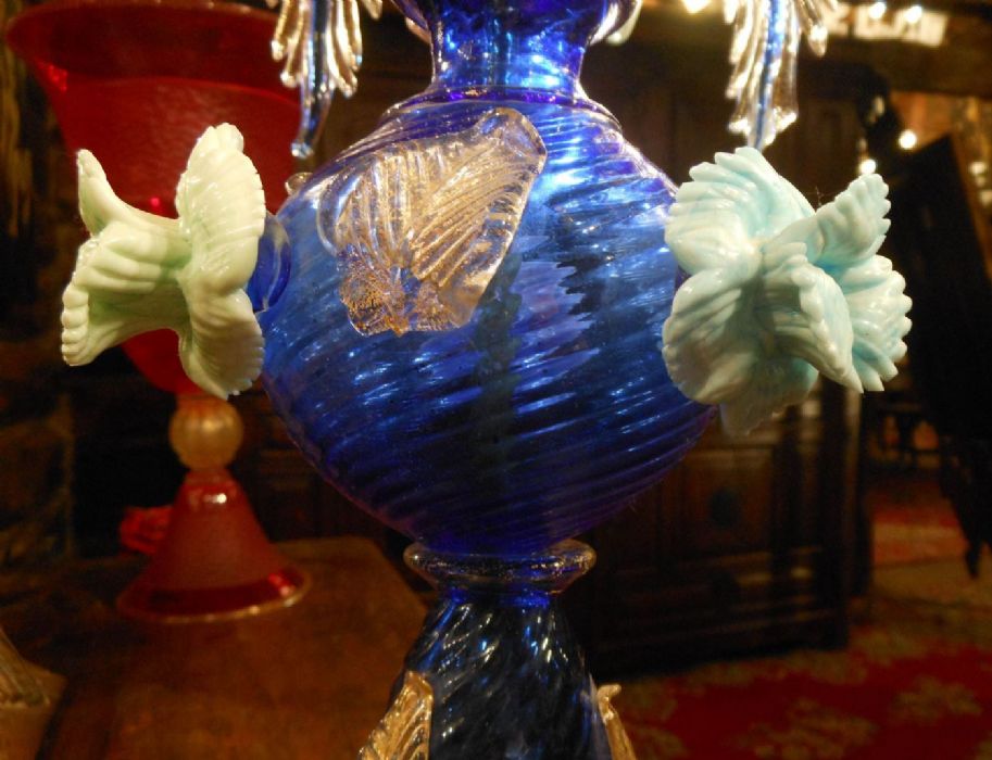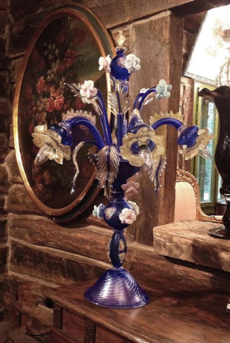 Il nostro flambeau in vetro di Murano, di estrema rarità, ha una caratteristica colorazione blu cobalto chiaro, la cui tonalità è detta "Blu Vicenza", con sfumature in oro zecchino in mestica vitrea.