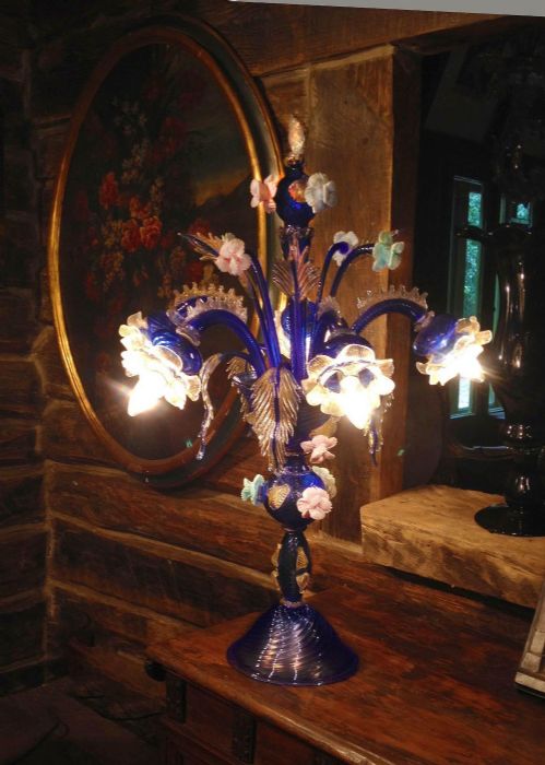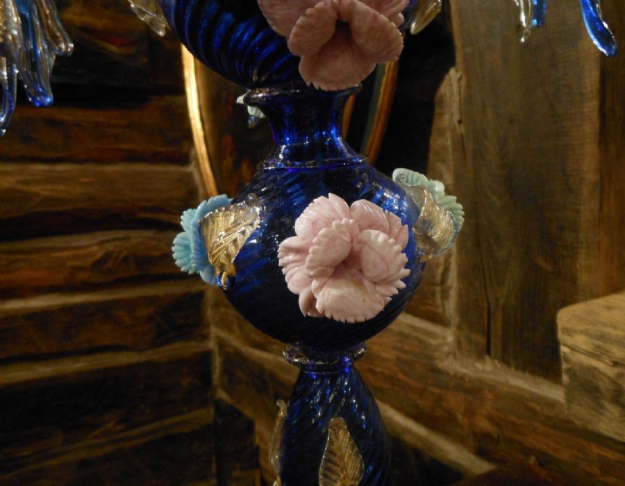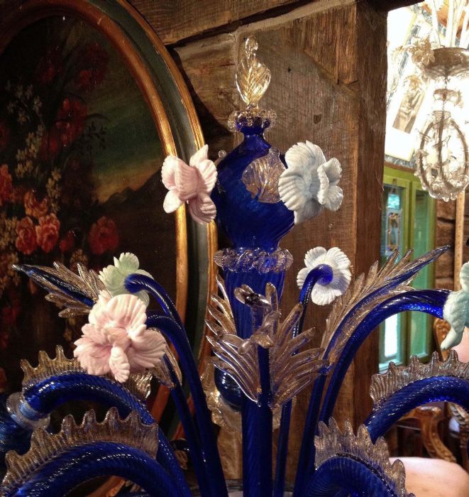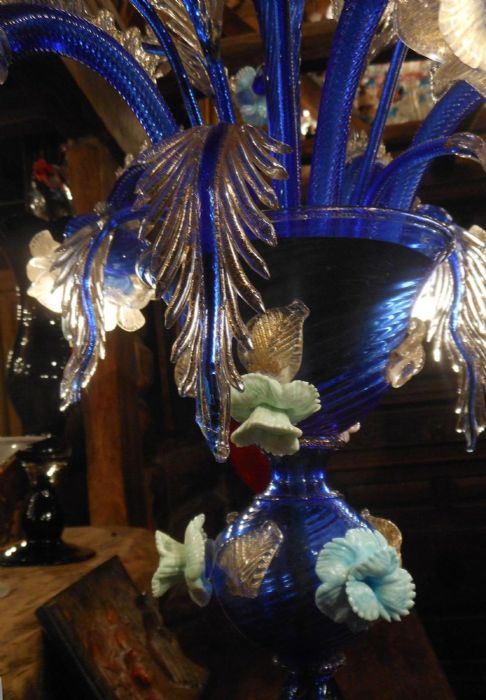 Il nostro flambeau in vetro di Murano, di estrema rarità, ha una caratteristica colorazione blu cobalto chiaro, la cui tonalità è detta "Blu Vicenza", con sfumature in oro zecchino in mestica vitrea.