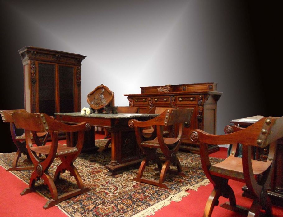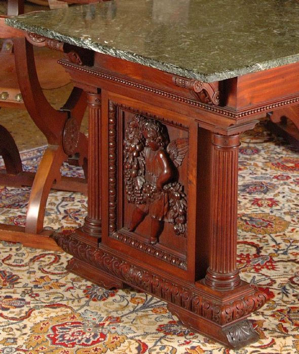 Il tavolo è in mogano massiccio con ai lati importanti sculture ricavate dal massello di legno raffiguranti angeli. Adornato con due coppie di colonne che vanno a congiungersi alle greche della grambialina, interamente eseguito a mano, il piano in marmo verde con venature bianche ne esalta l'eleganza dell'insieme.