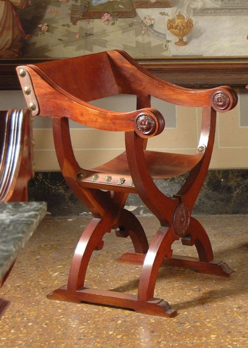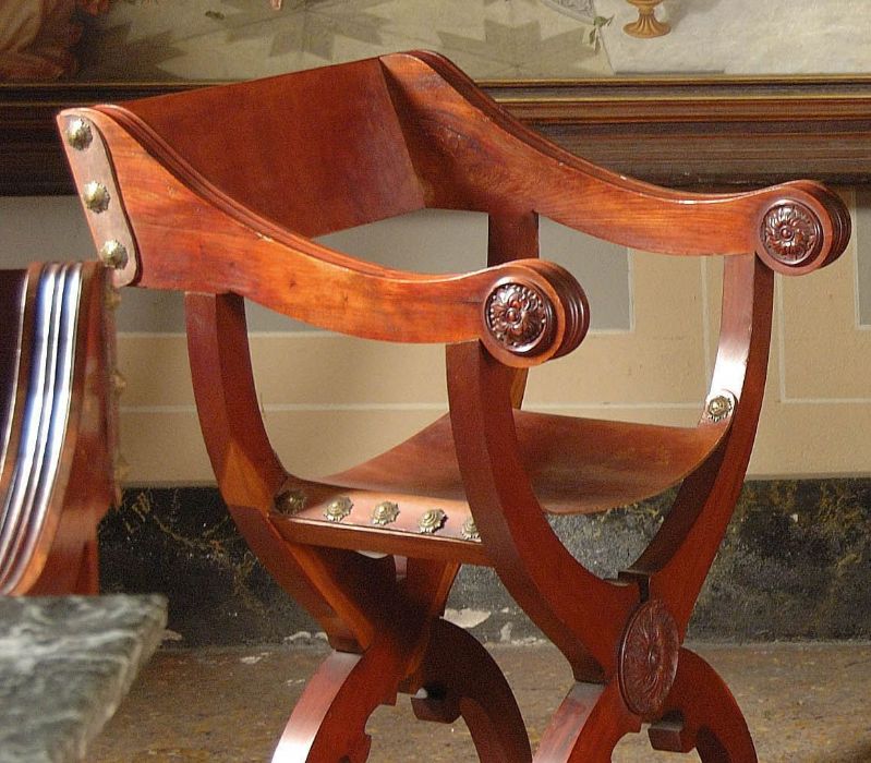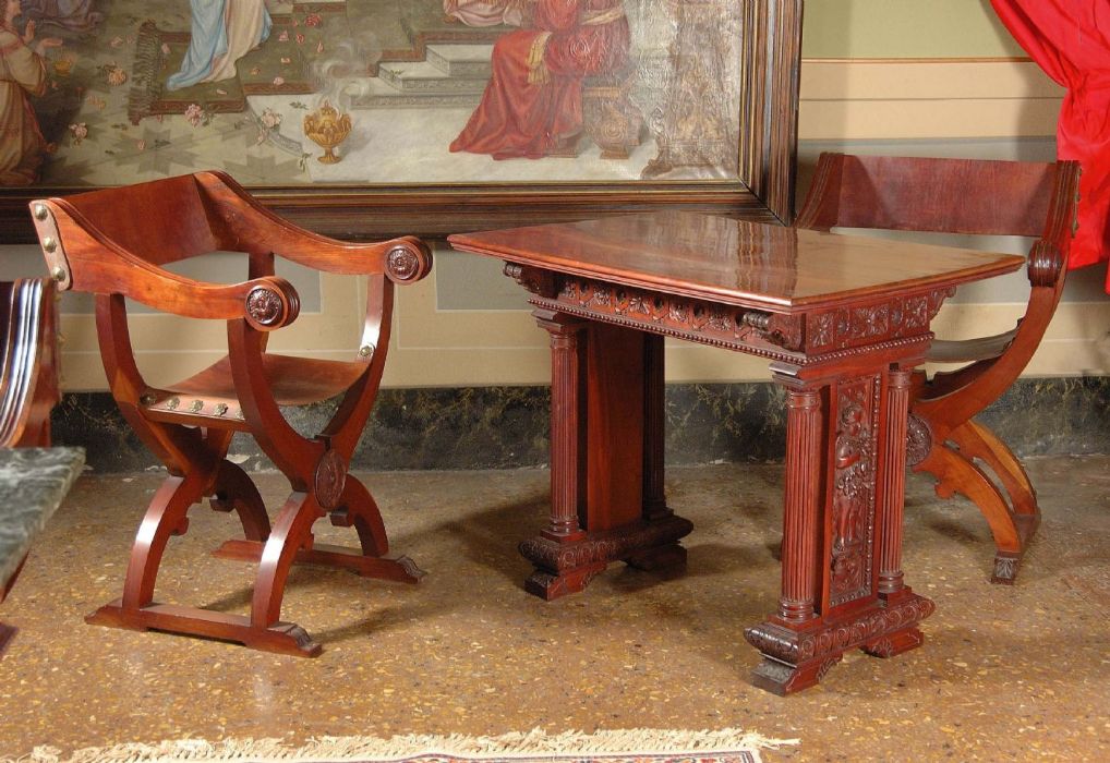 Le otto sedie alla "Dantesca" (un tipo di sedia derivata da quella altrimenti detta "alla Savonarola"), sono magistralmente intagliate a mano nel massello di mogano con seduta e schienale in cuoio. Austere, eleganti e "comodissime"!