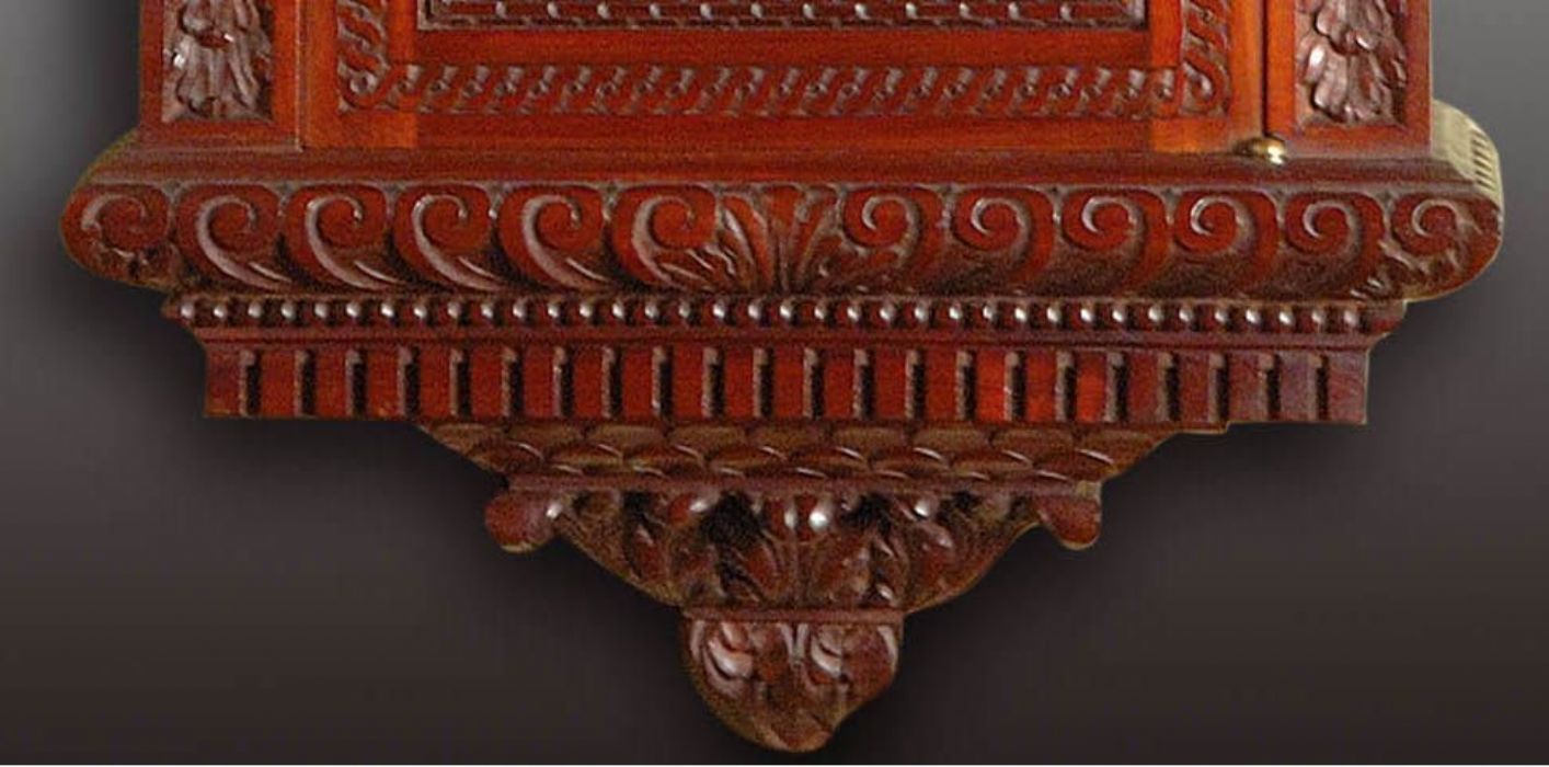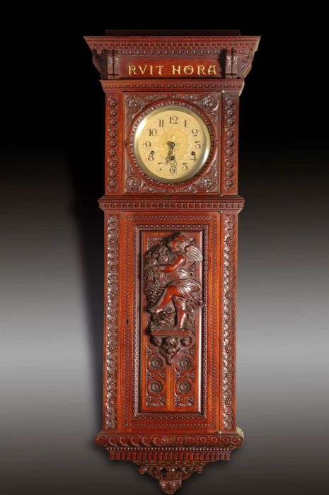 Importante orologio a pendolo da parete in mogano massiccio con angelo beneaugurante scolpito sul frontale col viso rivolto verso il quadrante. Due sportelli con serrature. Meccanismo 4/4 tedesco, marcato Kienzle. Suona coi toni del Big Ben. In alto la scritta in latino "Ruit Hora", il tempo scorre.