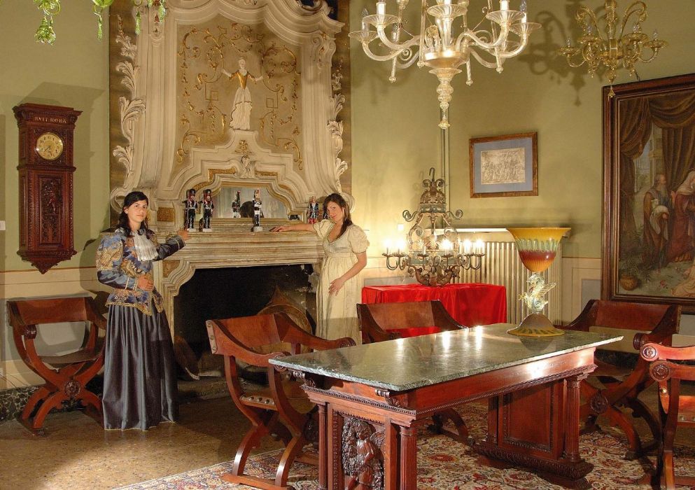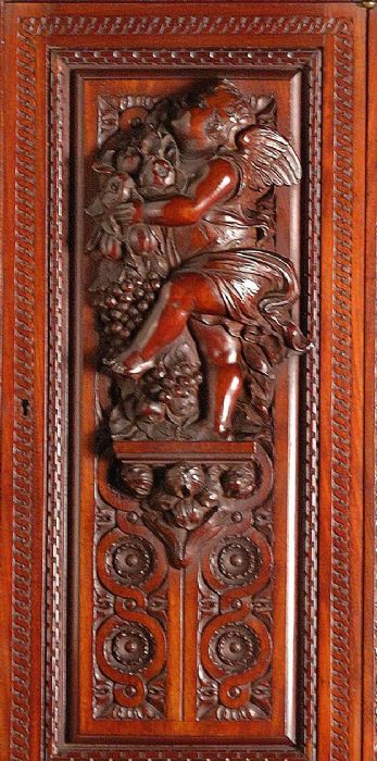 Fa parte della importante camera da pranzo neo-rinascimentale dello stesso autore che può essere proposta nel suo insieme così come fu commissionata al Maestro nel 1930 (data e firma dell'autore sono visibili alla base del bassorilievo raffigurante la Madonna col Bambino).