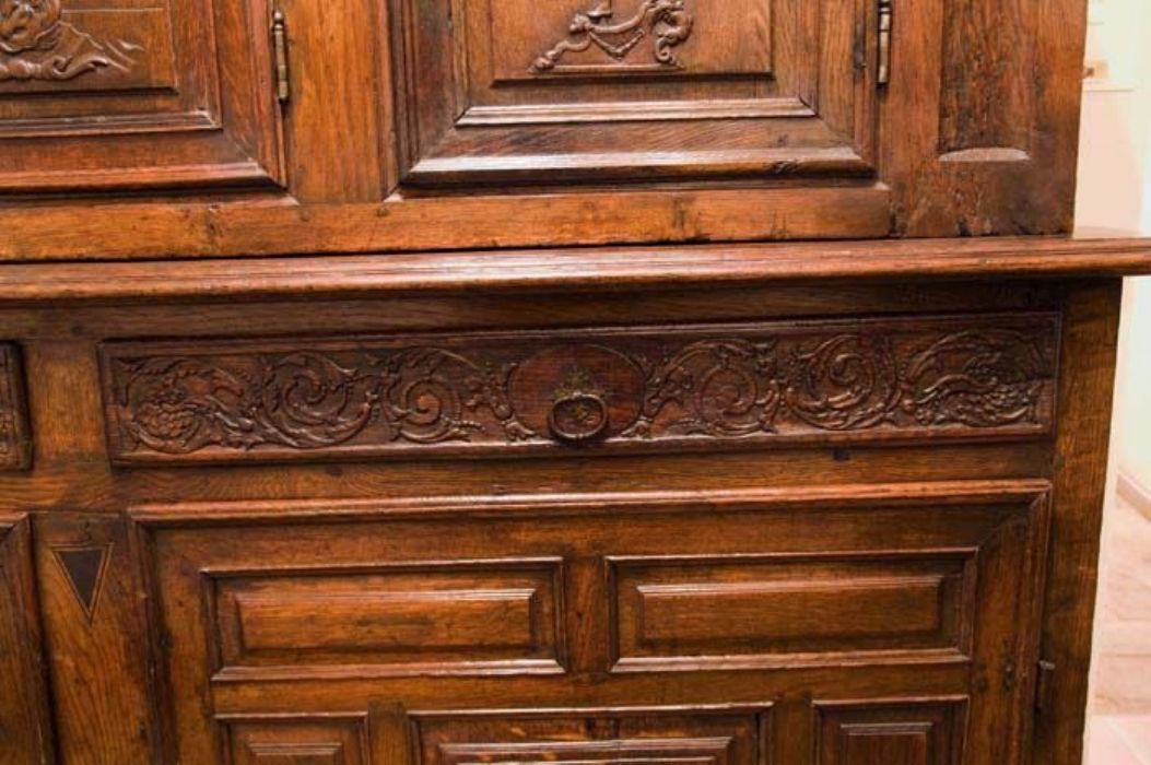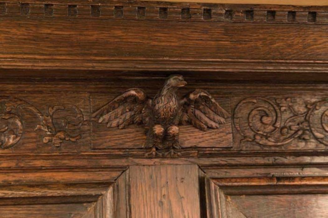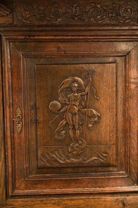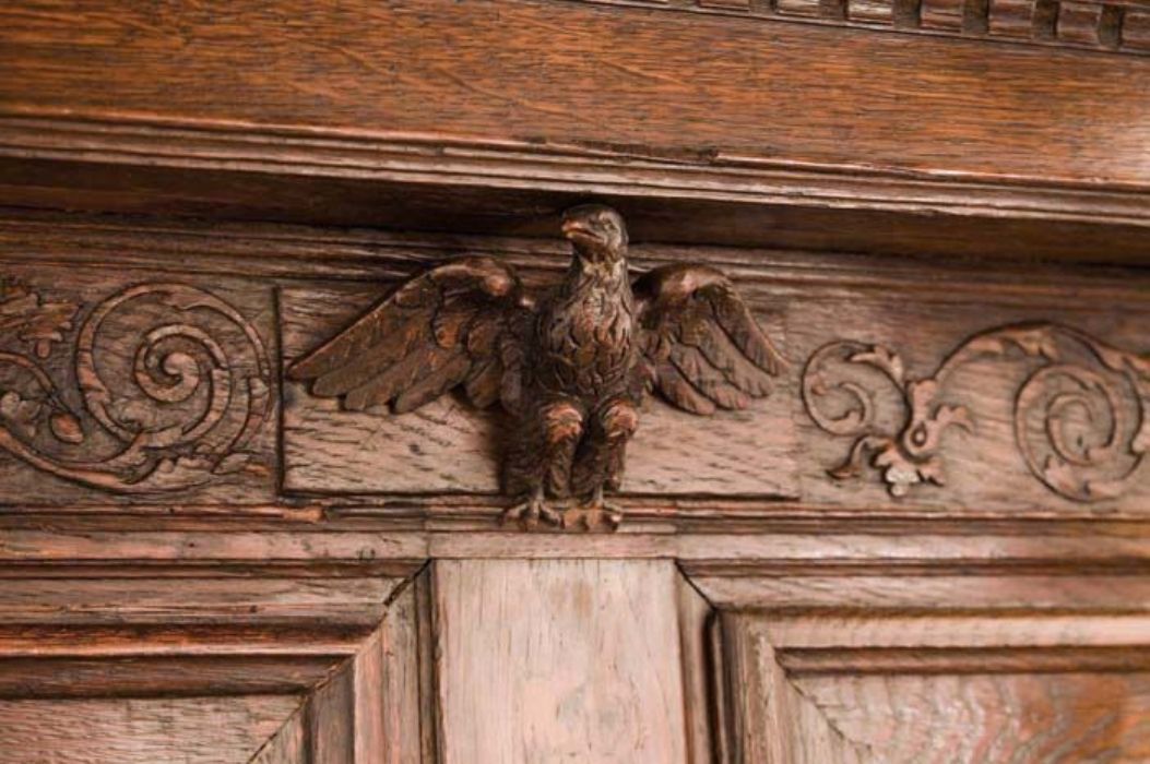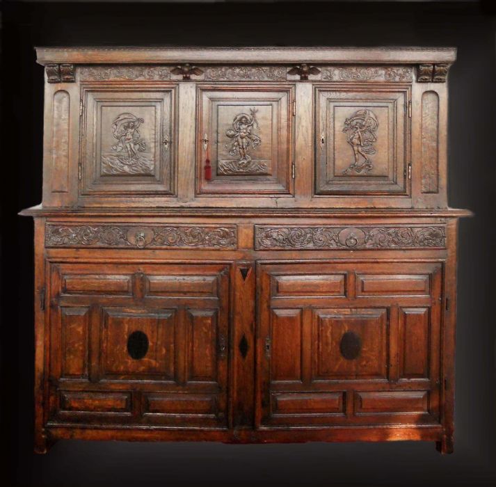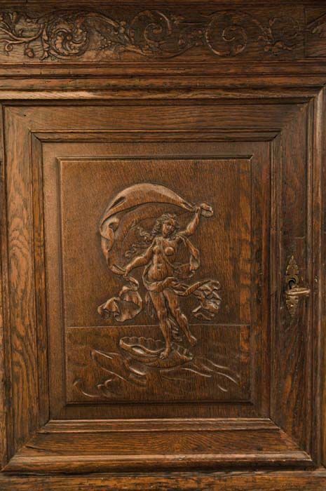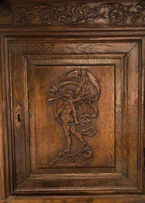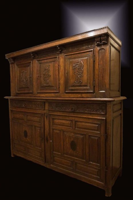 Raffinato mobile di chiara impronta nobiliare in legno di quercia massiccio e legni vari. Pregevoli cartigli a motivi floreali sul fronte, coppia di aquile scolpite ed intagliate e capitelli che sorreggono la cimasa con greche frontali e laterali. Tre sportelli con ben delineate figure mitologiche ed allegoriche intagliate a bassorilievo e tutto tondo. Due cassetti sottostanti con cartigli vegetali a volute che si rincorrono. Due ante riquadrate a motivi geometrici, presenza di decori in legno ebanizzato e filettature in bosso.
