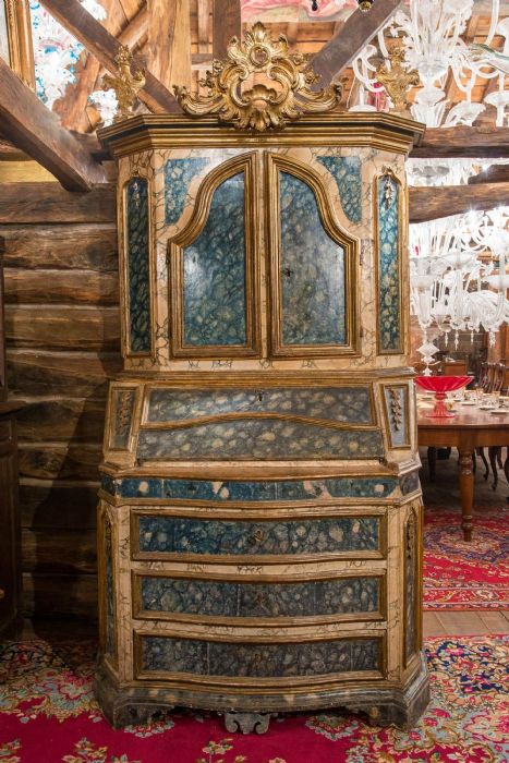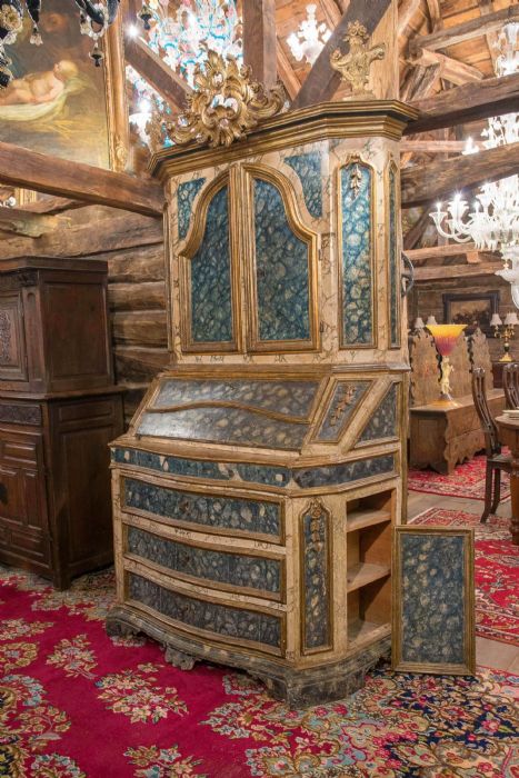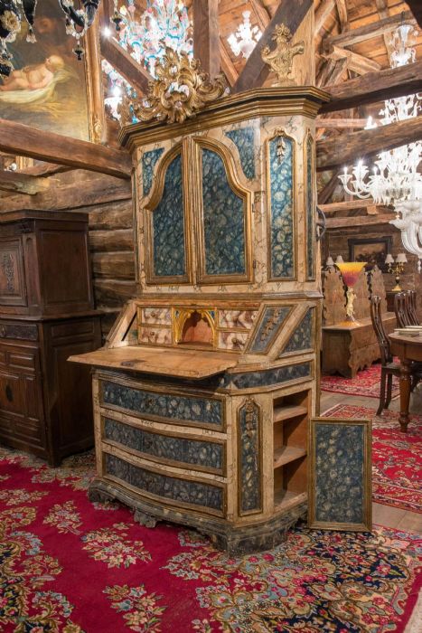 Eccezionale  "Trumeau" o cassettone con ribalta e alzata, in legno di pioppo e legni vari, integralmente dipinto, dorato e laccato "a mecca". La "calatoia" o ribalta aveva anticamente funzioni di scrittoio. In genere l'alzata conteneva porcellane ed argenti, di particolare preziosità e da collezione. Questo mobile, di raffinatissima fattura appartiene, dal punto di vista formale, ad un' epoca , il Settecento, di cui sarà storicamente l'indiscusso protagonista. Qui le forme curvilinee, pur evidenti, tendono ad attenuarsi, sottolineate dalla meravigliosa decorazione "a finto marmo", realizzata a "mecca" su varie tonalità dei grigi ed arricchita da cornici dorate e fregi  delicatamente intagliati con foglie e fiori.