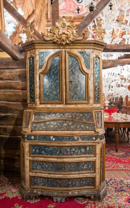 Eccezionale "Trumeau" o cassettone con ribalta e alzata, in legno di pioppo e legni vari, integralmente dipinto, dorato e laccato "a mecca". La "calatoia" o ribalta aveva anticamente funzioni di scrittoio. In genere l'alzata conteneva porcellane ed argenti, di particolare preziosità e da collezione. Questo mobile, di raffinatissima fattura appartiene, dal punto di vista formale, ad un' epoca , il Settecento, di cui sarà storicamente l'indiscusso protagonista. Qui le forme curvilinee, pur evidenti, tendono ad attenuarsi, sottolineate dalla meravigliosa decorazione "a finto marmo", realizzata a "mecca" su varie tonalità dei grigi ed arricchita da cornici dorate e fregi delicatamente intagliati con foglie e fiori.