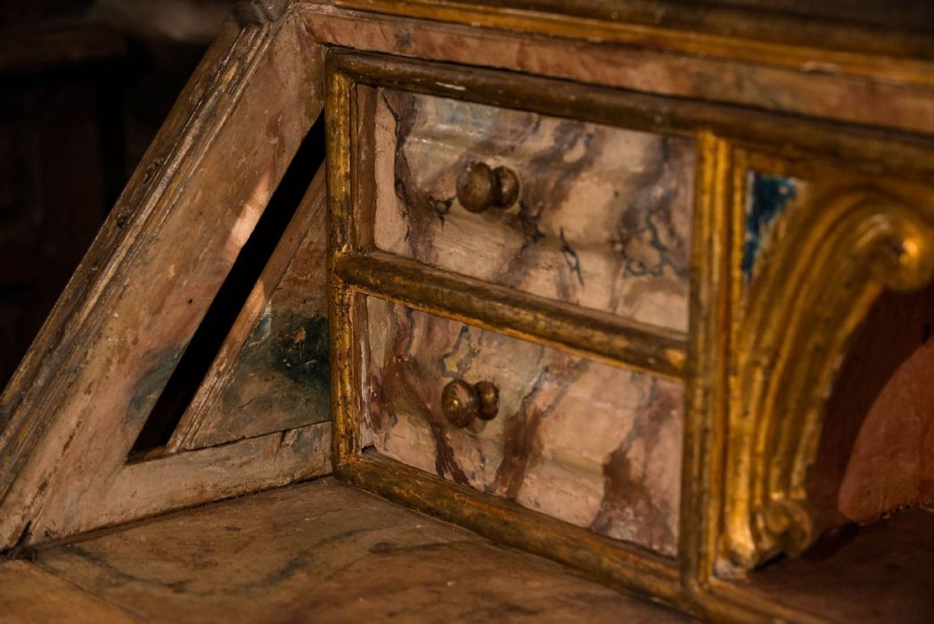 Aprendo la ribalta, quasi a voler schiudere uno scrigno prezioso, ammiriamo una particolare decorazione, sempre a finto marmo, nelle tonalità dell'arancio fino al grigio chiaro delicatamente sfumato. Cornici dorate completano elegantemente l'insieme adornando i quattro cassettini del bellissimo mobile. Secondo la tradizione, che individuava nei trumeaux più ricercati e di squisita fattura la presenza di "optional" destinati a stupire, anche nel nostro mobile troviamo diverse "segrete" sia sul lato destro e sinistro, sia al centro. In aggiunta, sui due lati esterni del cassettone, si trovano, sapientemente celate e sfilabili, altre due ante segrete di maggiori dimensioni. L'insieme dei cassetti centrali, sfilabile anch'esso e detto "scarabattolo", e delle segrete, dona a questo capolavoro di alta ebanisteria un' aspetto "misterioso", idealmente utilizzato per nascondere documenti, carteggi amorosi e oggetti esclusivi "da cassaforte".