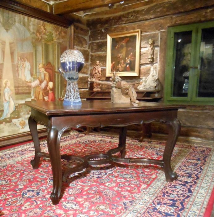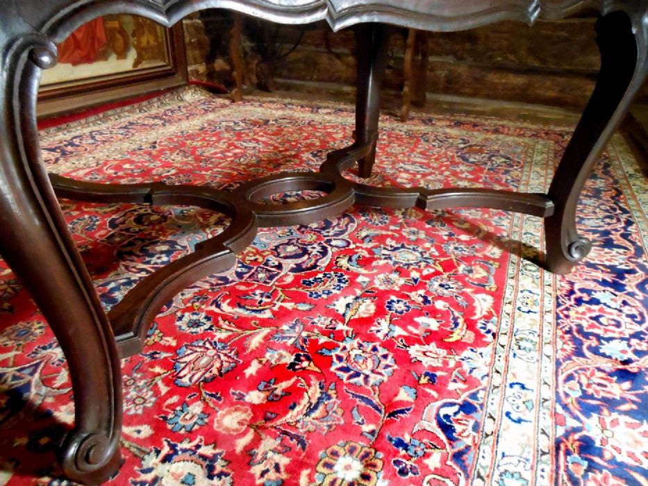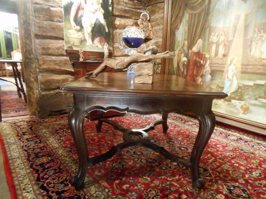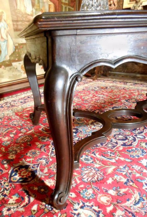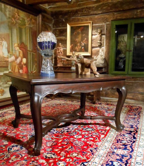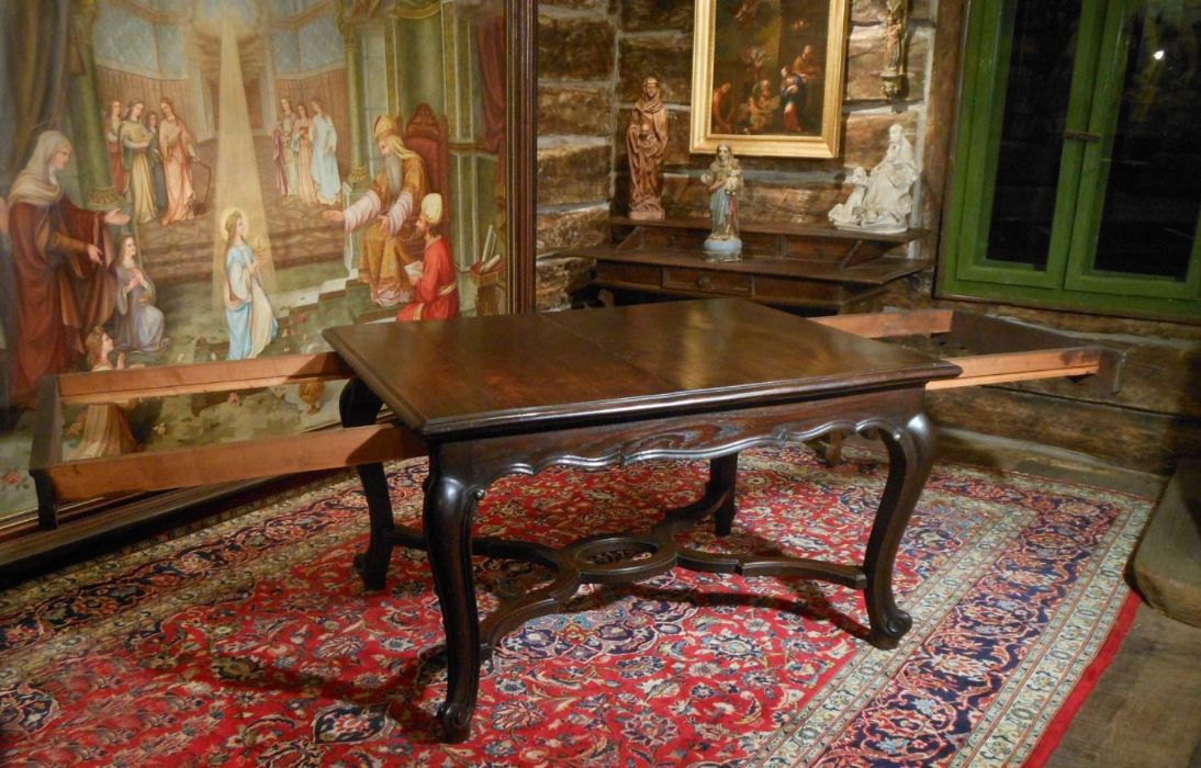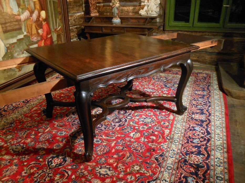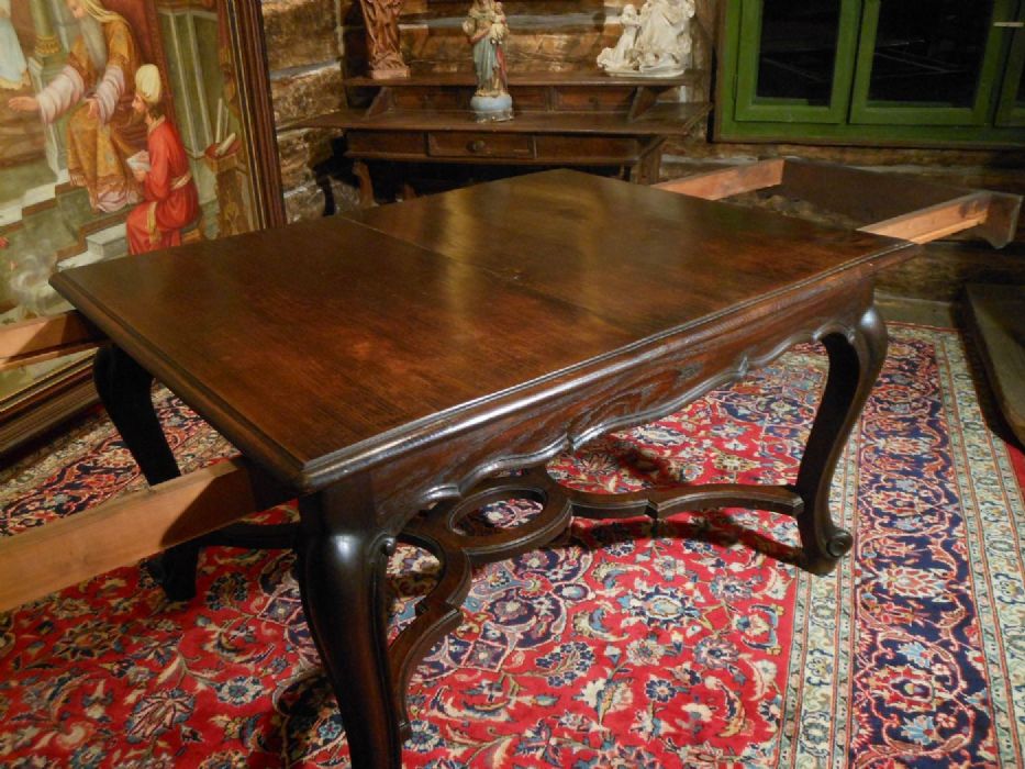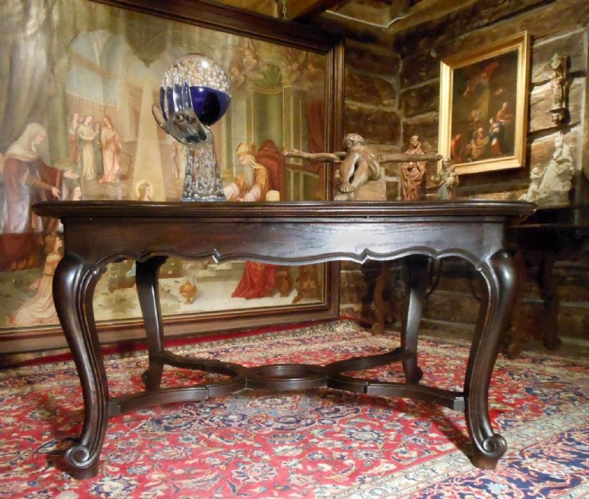 Gradevole tavolo in rovere massiccio allungabile. Estremamente massiccio ma anche elegante nell'impianto costruttivo che ricorda lo stile Luigi XV. Imponenti gambe "cabriolet" supportate da parte centrale a croce greca con classico cerchio centrale che ne accentua l'importanza come mobile da centro sala per tutti gli usi. Cornice sottostante il piano (che si presenta di ottimo spessore) modanata e con disegno a cartiglio.
