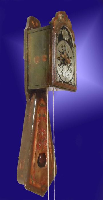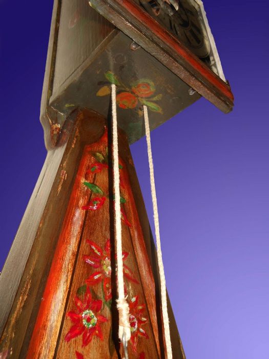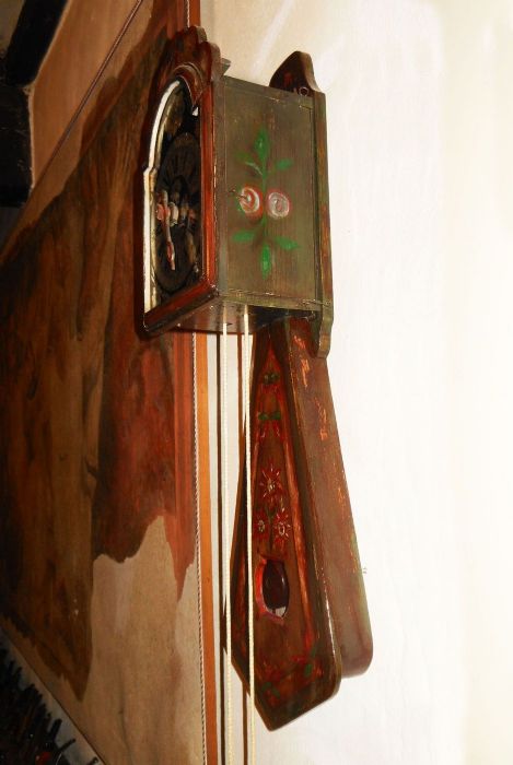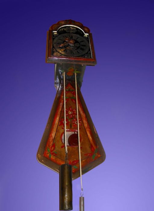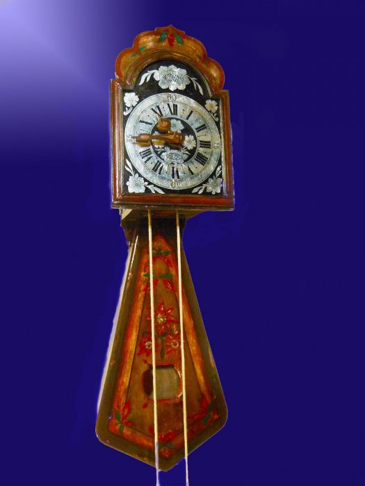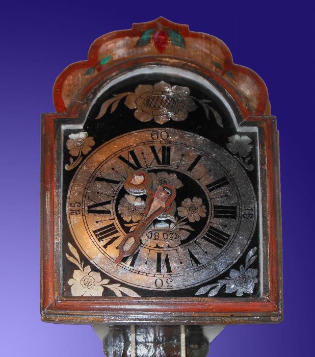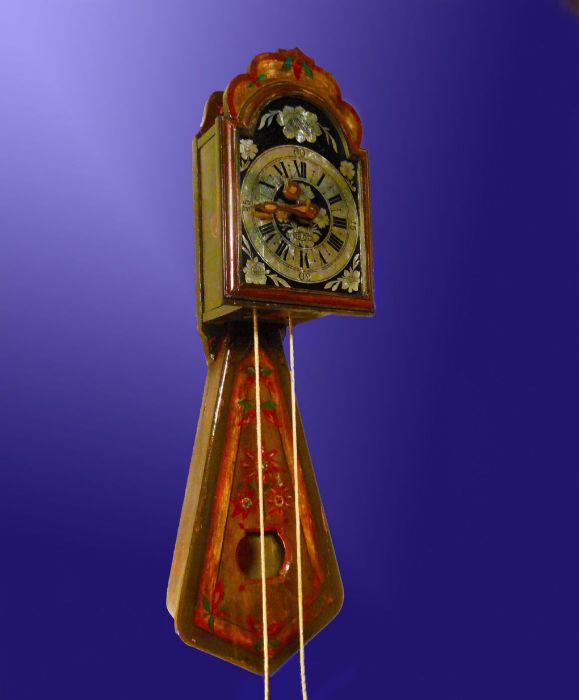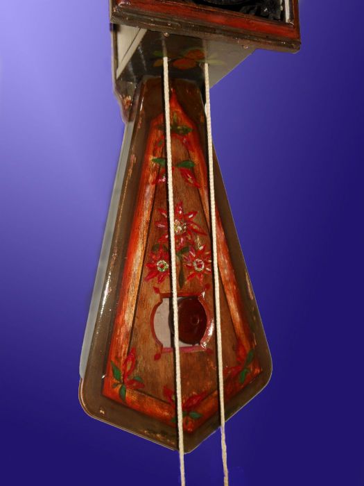 L'orologio è infatti interamente dipinto, con stelle alpine, fiori e frutti. La caratteristica cassa porta pendolo ha una forma curiosa detta "a coda di rondine" con una finestrella che lascia intravvedere l'oscillazione della lente del pendolo.