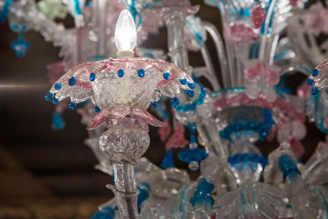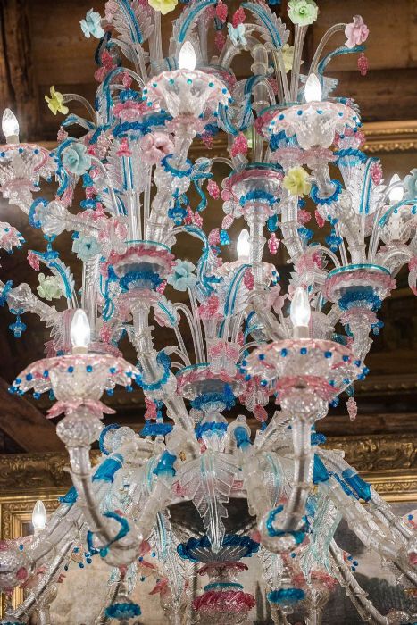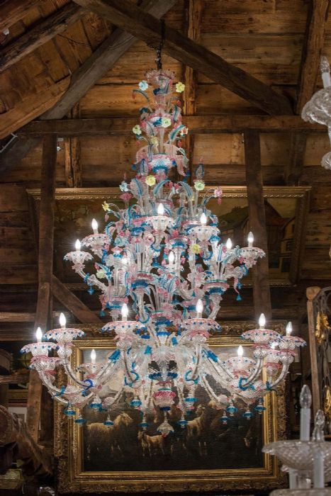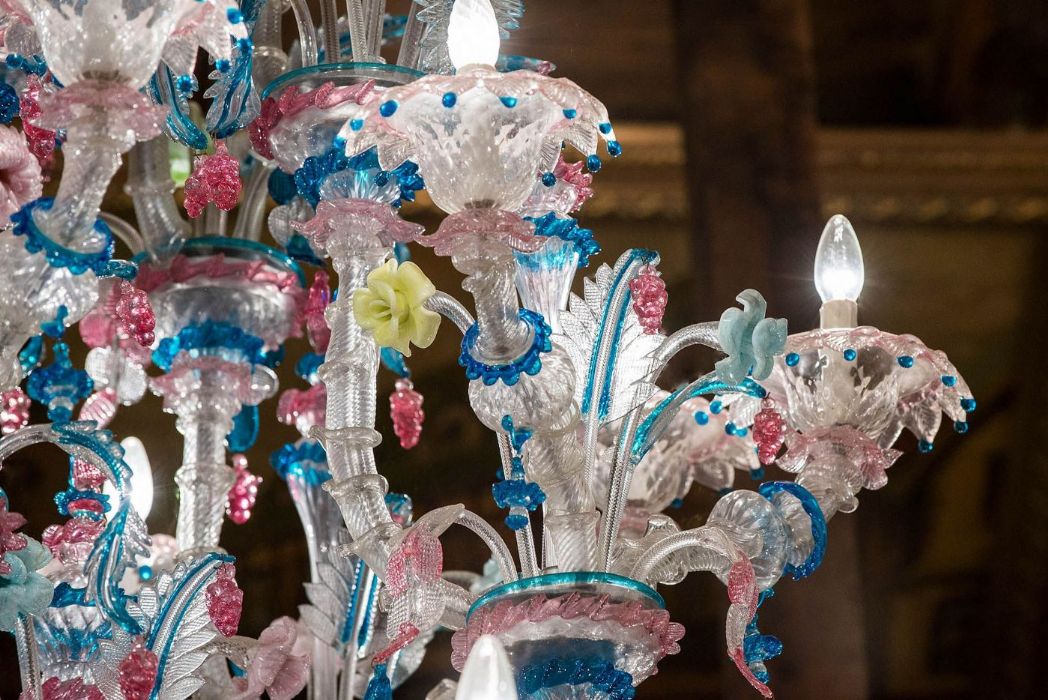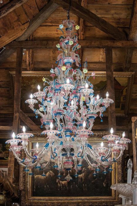 Imponente lampadario a 20 luci o "fuochi" in su (12+8) con 12 cimieri, realizzato con assoluta maestrìa secondo il tipo "Cà Rezzonico". Opera monumentale di altissima scuola e raffinatezza, in vetro cristallino, con fiori in pasta vitrea policroma.