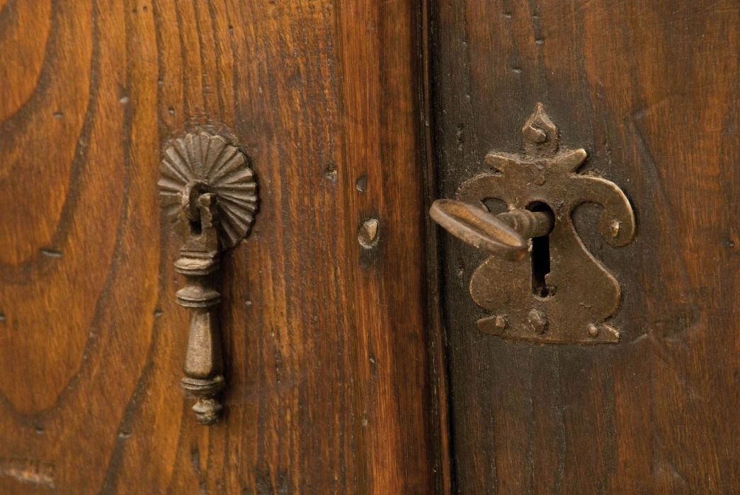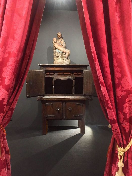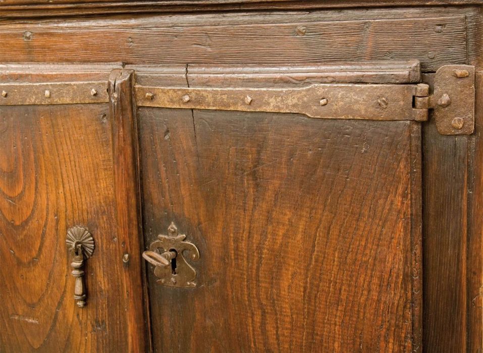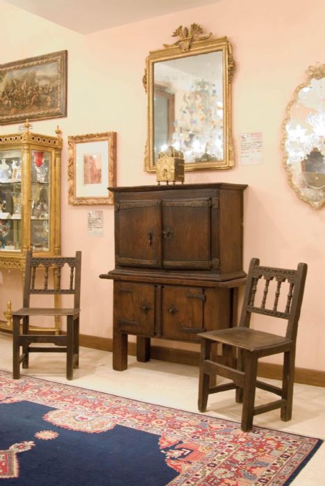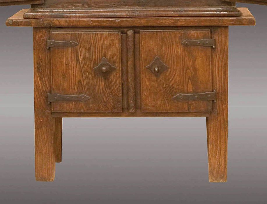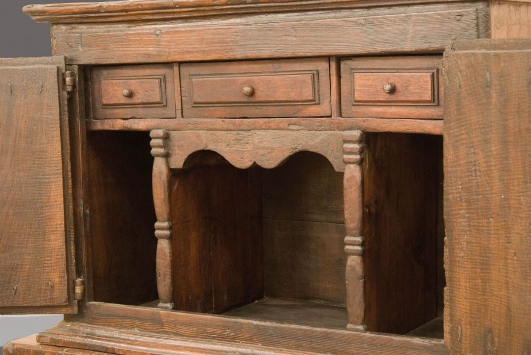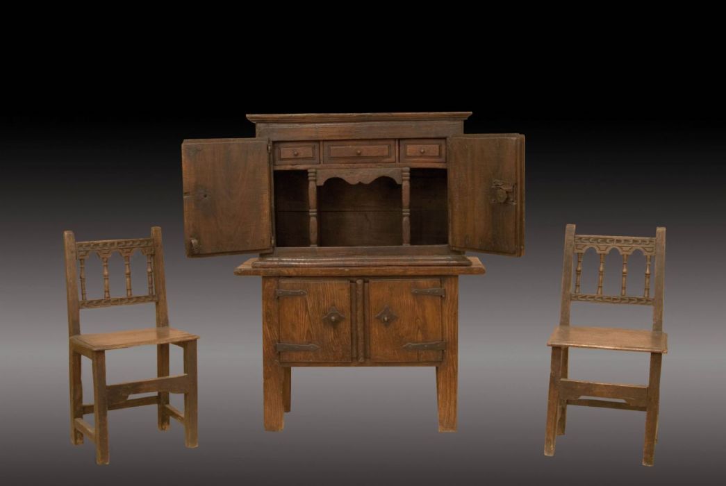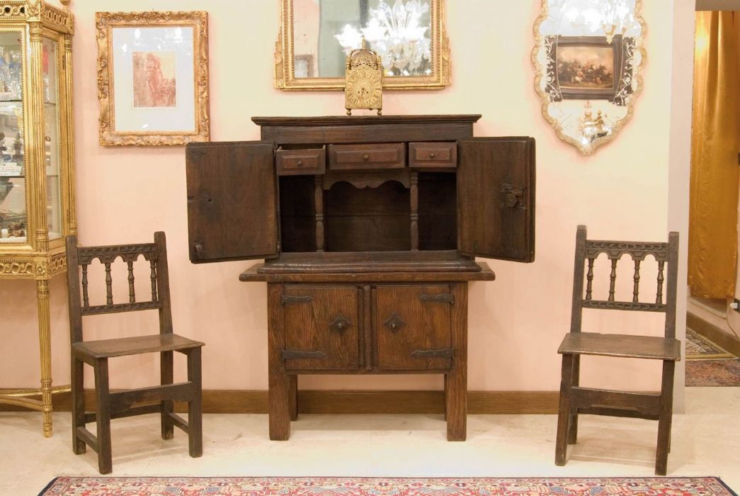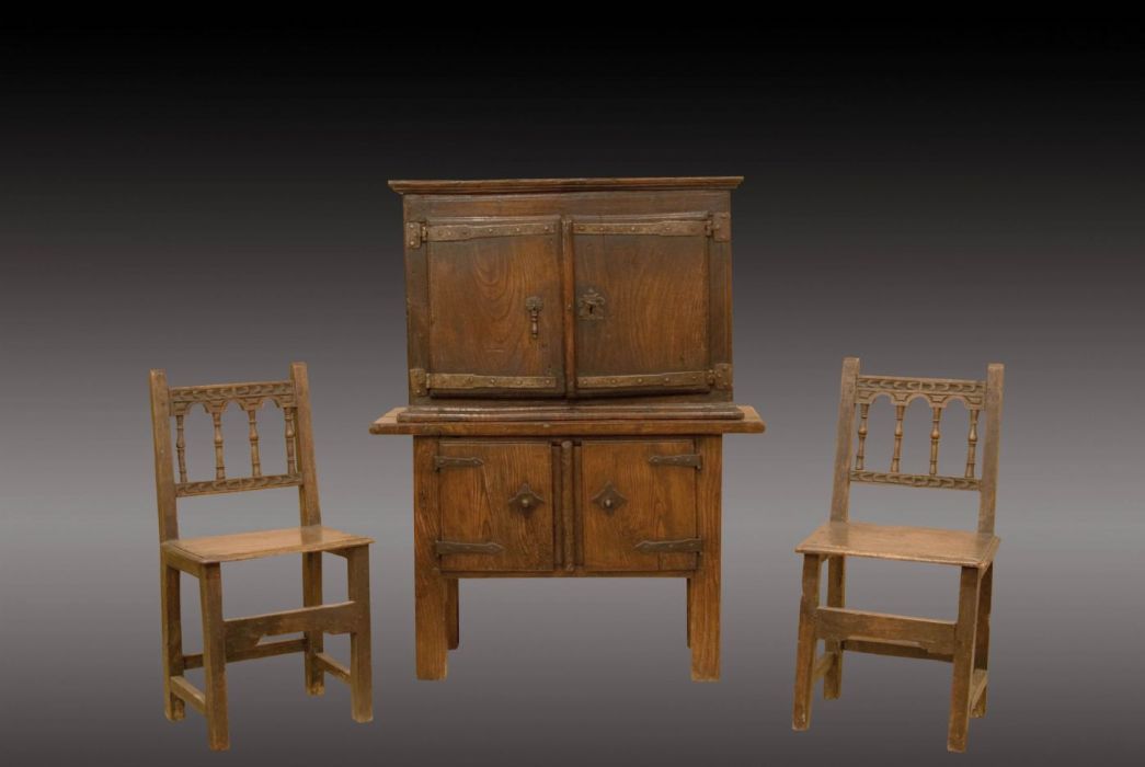 Rarissima credenza gotica spagnola a doppio corpo e due sedie in castagno massiccio con parte superiore a 2 ante, 3 cassetti e 3 nicchie con caratteristico porticato. Corpo inferiore a 2 ante. Ferrature originali dell'epoca. Interessanti le "sgorbiature" che caratterizzano i piani del mobile e ne testimoniano l'epoca. Il mobile, proveniente da un'antica roccaforte castigliana, appartiene al periodo Gotico Mudejar spagnolo (che inizia proprio nel XV sec.). Le 2 sedie in castagno massiccio di pari epoca e stile, sono nate di supporto alla credenza. Il mobile, in eccezionale stato di conservazione ed autenticità, è stato selezionato da un comitato di esperti a livello internazionale, pubblicato ed esposto nel 2000, alla mostra storico-rievocativa di Imola (Bologna) dedicata a Caterina Sforza, signora di Romagna e vissuta nel XV/XVI sec.