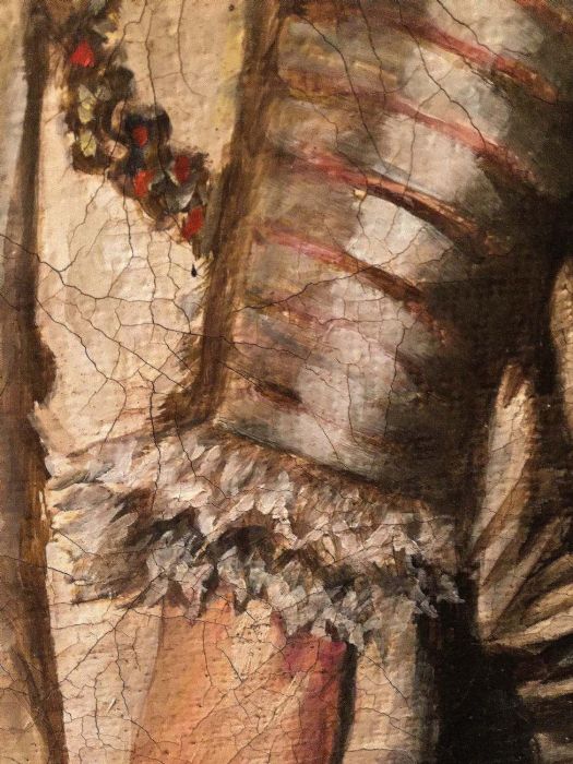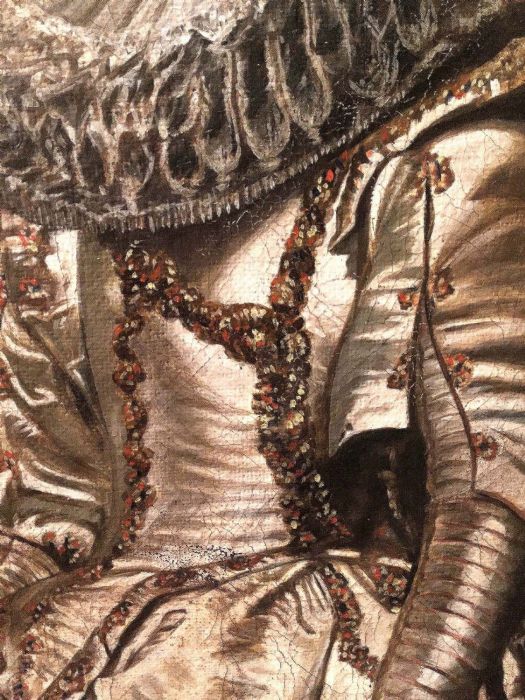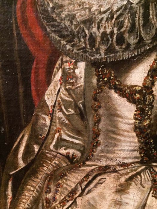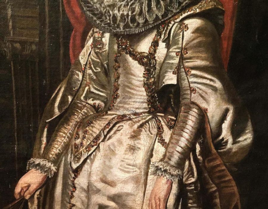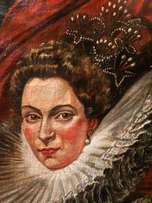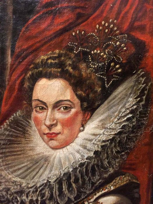 L’anonimo pittore che si è cimentato nel reinterpretare uno dei celebri ritratti del Rubens, ha saputo cogliere con bravura alcuni particolari del quadro originale. L’acconciatura elaborata della dama impreziosita con bellissime spille di perle che danno una sensazione tattile, quasi si potesse sentire la morbidezza del tessuto in raso di seta del magnifico abito, arricchito da bottoni d’oro. Abile anche nel dipingere la gorgiera (colletto), a pieghe molto fitte e strette, che normalmente veniva realizzata in lino o in mussola inamidata .