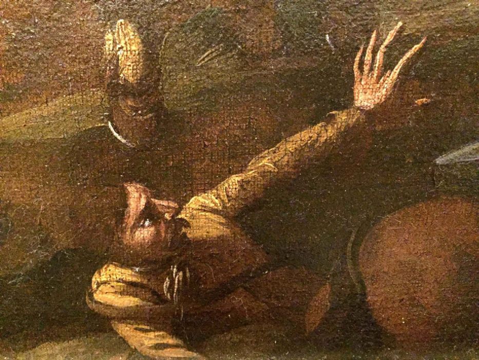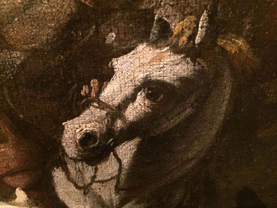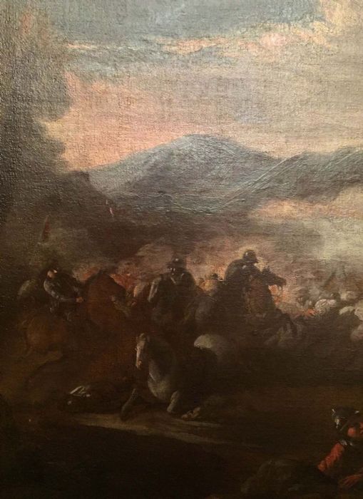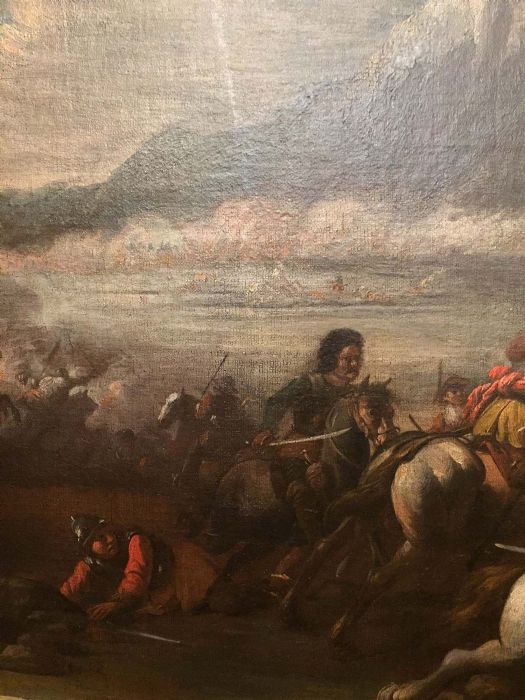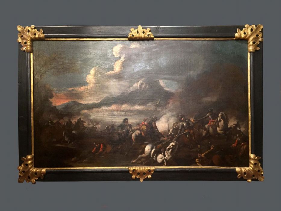 Importante dipinto ad olio su tela, cm. 87 x 146. Opera autografa di Francesco Monti, detto Il Brescianino delle Battaglie – entro cornice lignea intagliata e scolpita con inserti dorati a foglia.