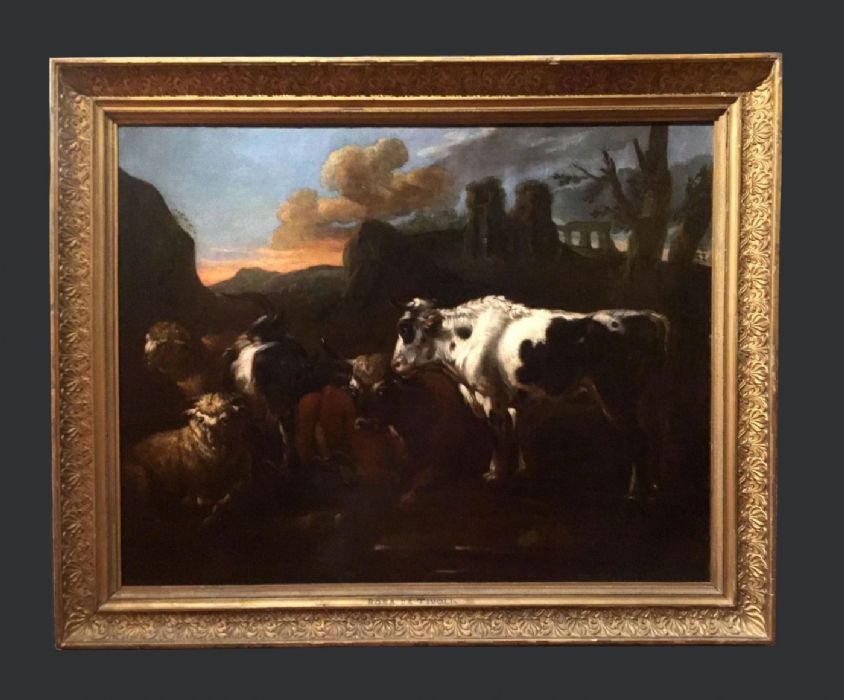 Dipinto a olio su tela, cm.90 x 113 – opera autografa di Philipp Peter Roos, detto Rosa da Tivoli – entro cornice lignea antica intagliata e dorata.
