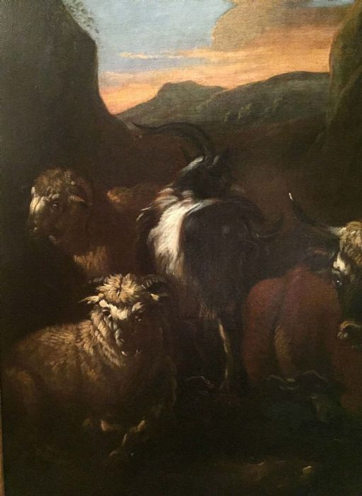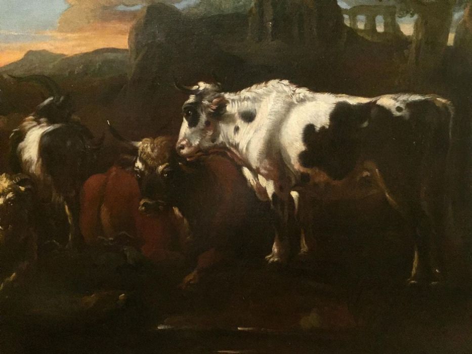 Philipp Peter Roos, detto Rosa da Tivoli (Sankt Goar (Francoforte sul Meno), 30 agosto 1657 – Roma, 17 gennaio 1706), fu un pittore ed incisore tedesco del periodo barocco. Apparteneva ad una nota famiglia di pittori e incisori tedeschi: suo padre era Johann Heinrich Roos, il più importante pittori di animali tedesco del XVII secolo. Giunse in Italia nel 1677 con una borsa di studio del Langravio di Assia, a condizione che ritornasse presso la sua corte. Tuttavia, disattendendo le condizioni del Langravio, non ritornò mai più in Germania. Studiò a Roma presso Giacinto Brandi, la cui figlia Maria Isabella sposò nel 1681, dopo aver abbracciato la Fede cattolica. Nel 1684-1685 acquistò una casa presso Tivoli, il che gli valse il nomignolo di Rosa da Tivoli. Roos allevava personalmente gli animali che dipingeva nei pressi di questa casa sgangherata, che per questo era detta "l'Arca di Noè". La casa si trovava nel rione San Paolo, ancora oggi detto "vicolo del Riserraglio". Gino Mezzetti, storico locale, ha scritto: «Per questa arteria, si usa far derivare il nome da quell'ambiente sbarrato, sito nella silenziosa piazzetta del rione, in cui il pittore tedesco Philipp Roos, detto Rosa da Tivoli (perché lavorava specialmente nel Tiburtino) rinchiudeva svariate bestie in un serraglio, che poi riproduceva nei suoi apprezzati quadri alcuni dei quali sono tuttora nella Pinacoteca Vaticana. Dal serraglio degli animali al "rinserraglio" e quindi al "Riserraglio" il passo è breve. Anche vicolo del Pittore, in via del Duomo, ha preso nome dall'artista, che in quella piccola arteria senza uscita abitava». A partire dal 1691 visse principalmente a Roma, dove divenne membro della Schildersbent (clan dei pittori) con il soprannome di "Mercurius", per la velocità con cui eseguiva i suoi dipinti e per la facilità con cui dipingeva. Questa rapidità di esecuzione gli era particolarmente utile: infatti, spesso senza denaro, dipingeva uno o due quadri che faceva vendere al suo domestico ad un qualsiasi prezzo per poter pagare il conto della locanda. Visse in modo deliberatamente libero, refrattario alle regole e dissoluto e, come spesso accadeva, allora come oggi, morì in miseria. La maggior parte delle sue opere rappresenta animali domestici con i propri mandriani nella campagna romana. Gli animali, come nel nostro dipinto, sono generalmente dipinti in primo piano e dominano la scena, mentre il paesaggio si intravvede al di sotto. Roos stende la sua pittura ad impasto rendendo i mantelli, la posizione e i movimenti di ogni specie con grande talento. Come si può notare anche nell’importante dipinto che qui proponiamo. Negli anni intorno al 1680 l'artista generalmente ritraeva piccoli gruppi di animali (pecore e capre, spesso guidate da un caprone con corna ricurve), con i pastori di lato in abiti grezzi, vicino agli animali. Lontano valli selvagge si alternavano a pareti scoscese illuminate da una luce giallo-bruna; le montagne distanti erano rese con i toni dell'azzurro. Sullo sfondo spesso erano dipinte antiche rovine. Intorno agli anni '90 del XVII secolo, Roos dipinse soprattutto paesaggi.