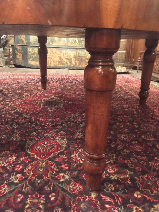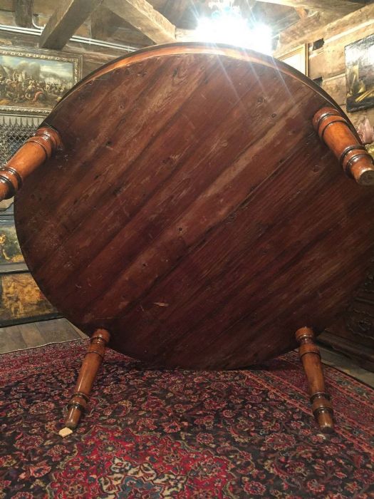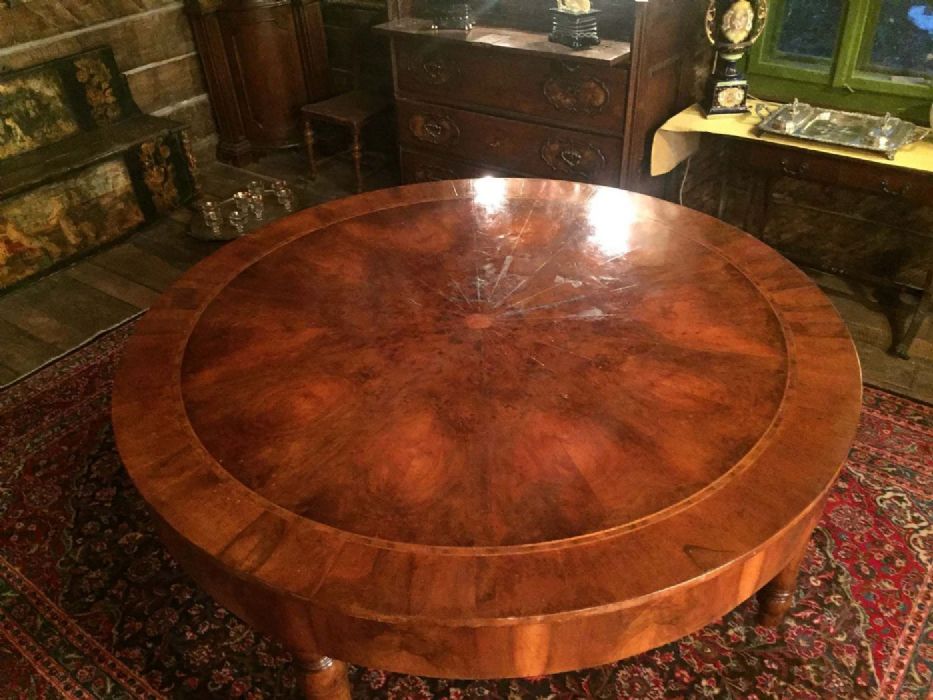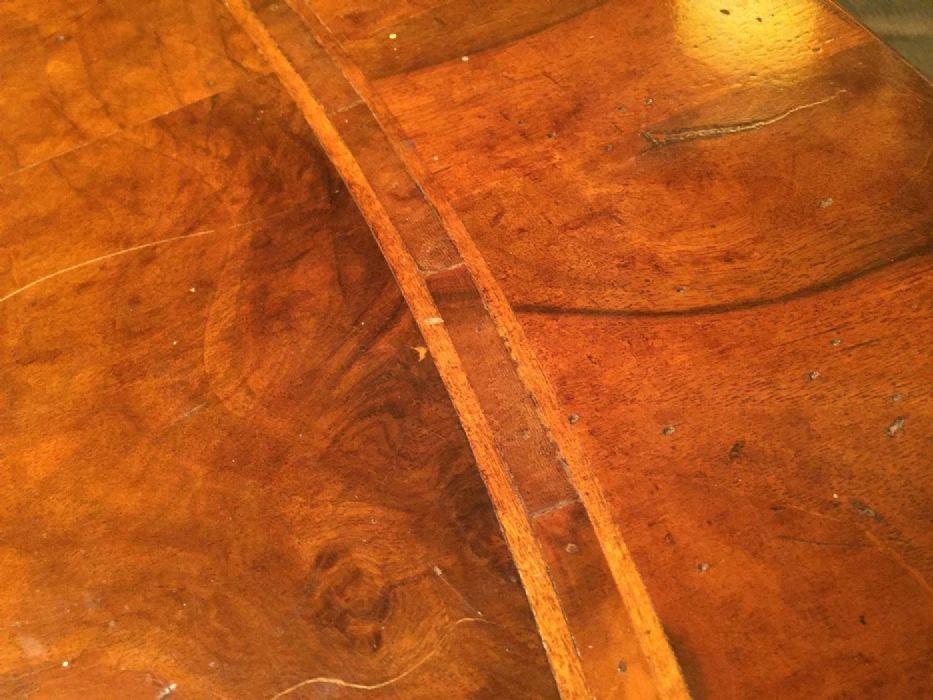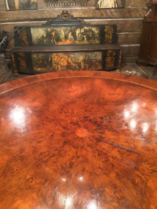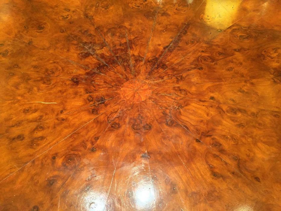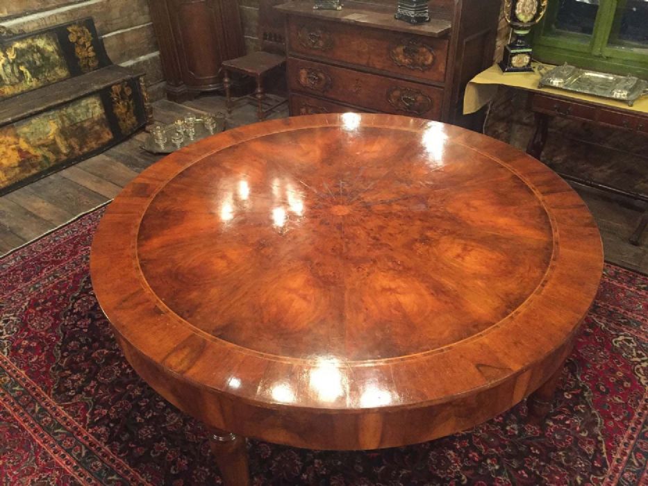Importante e raffinato tavolo in legno di noce lastronato a spicchi concentrici che esaltano la qualità della radica e della piuma di noce.