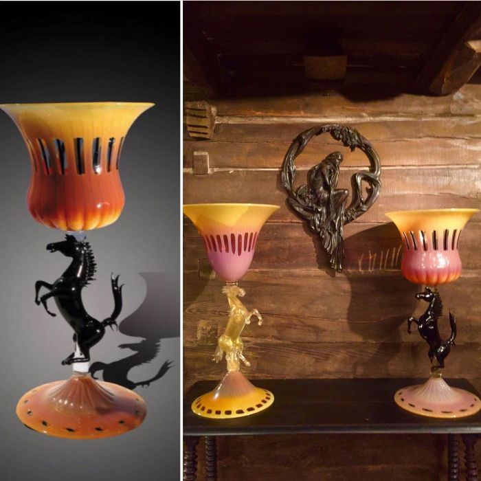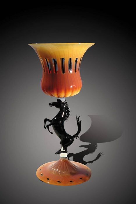 Importante cratere con cavallo rampante in vetro “nero hyalit”, lavorazione “a canne”, con scultura centrale “a nucleo pieno” o “a tutta massa”. L’opera fu realizzata dal maestro per onorare la memoria del grande pilota di Formula 1 della Ferrari Gilles Villeneuve. Lo stesso maestro la presentò al Comm. Enzo Ferrari in persona.
