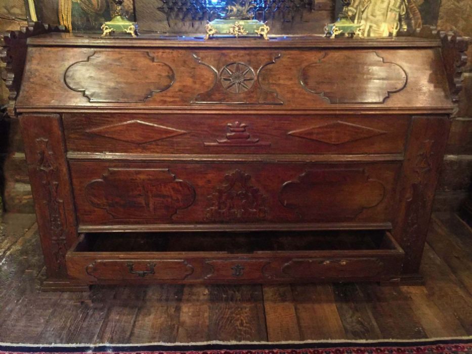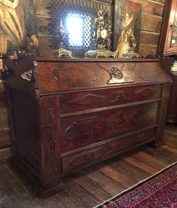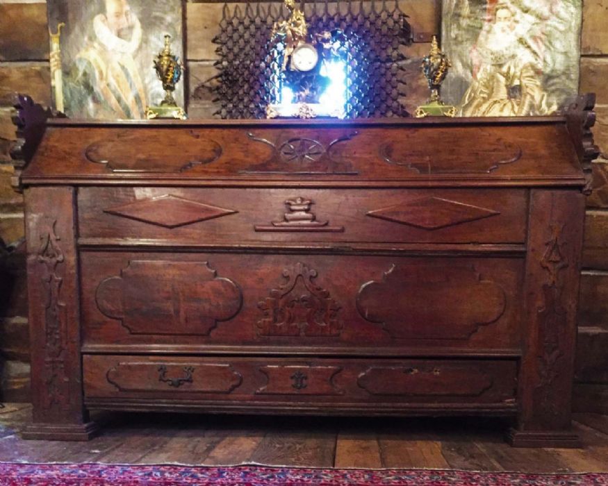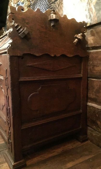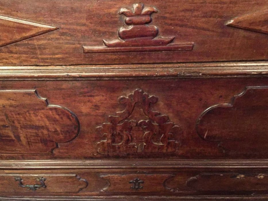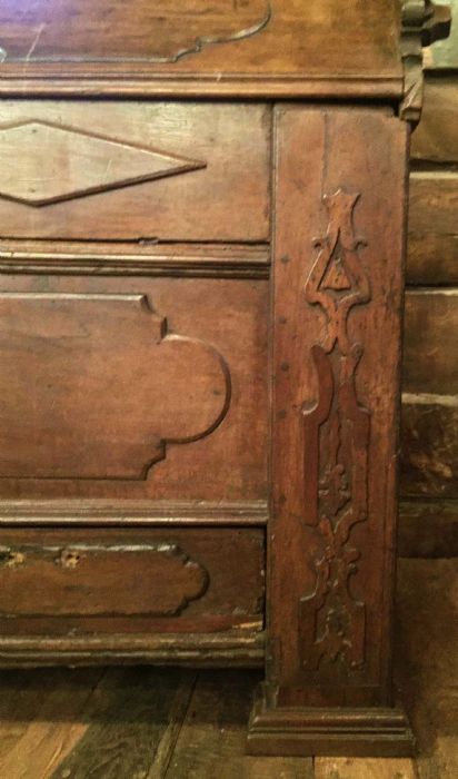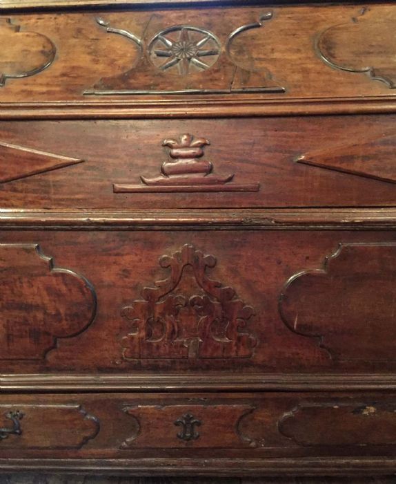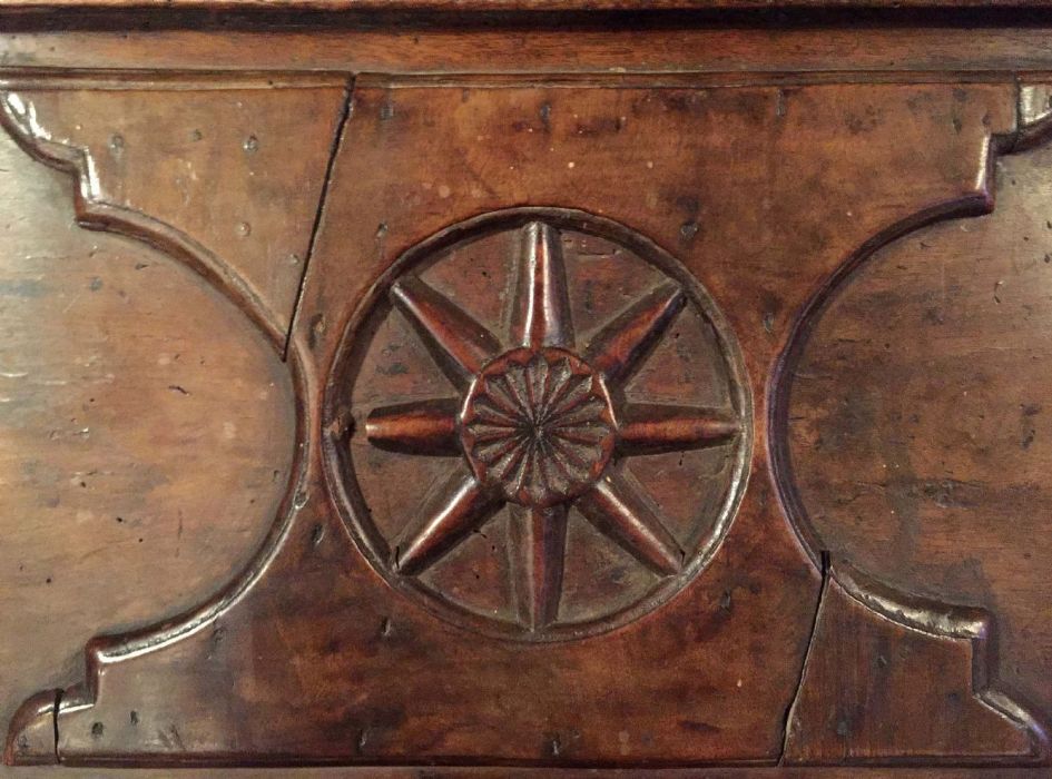 Imponente ed antico "arcile" in legno di noce massiccio e legni vari di classica "scuola Romagnola" di fine '500. Raro esempio di madia tardo cinquecentesca di raffinata fattura in prima patina, interessante anche per gli eleganti decori ad alto e basso rilievo raffiguranti segni beneauguranti e di prosperità. Caratteristica tipica di questi insoliti ed interessanti manufatti lignei era lo sfruttamento totale o pressochè totale di un unico ampio vano interno, in genere con il coperchio (o parte di esso) che si alza per accedere all'interno.