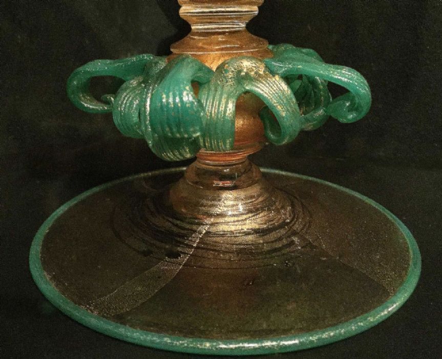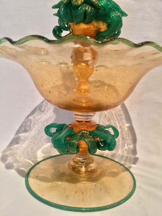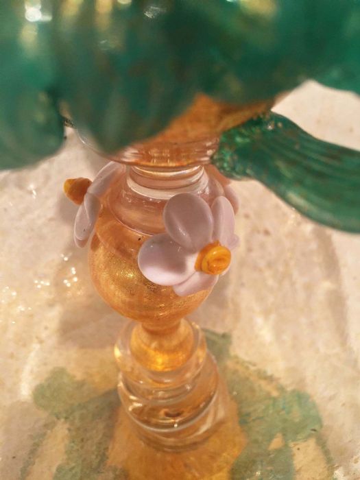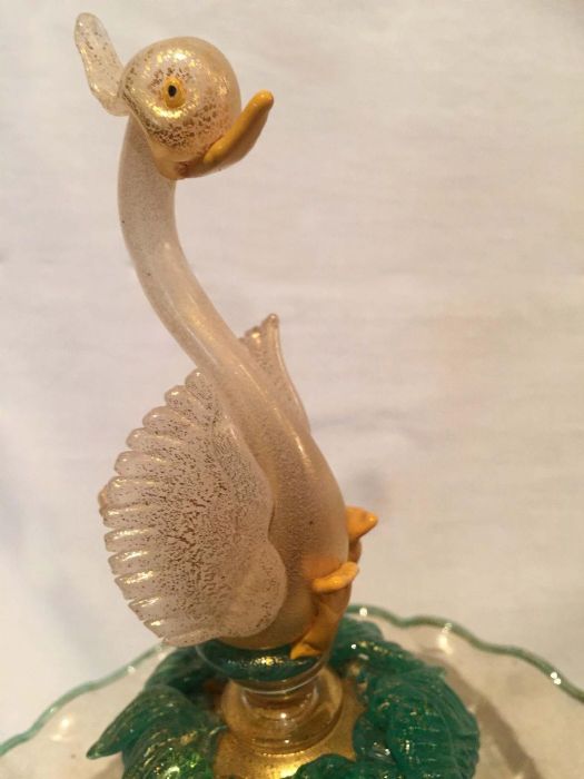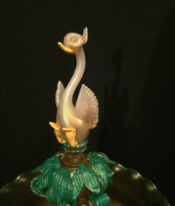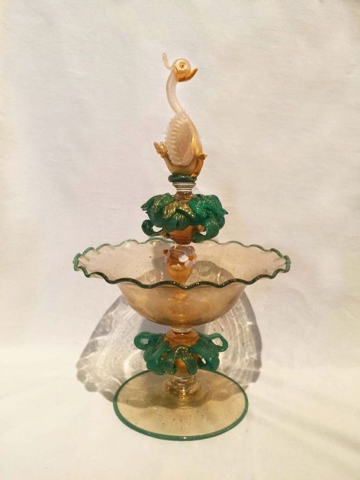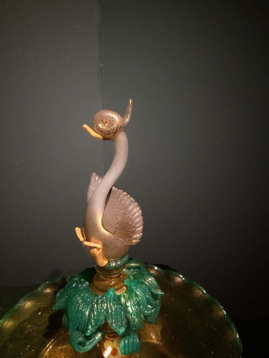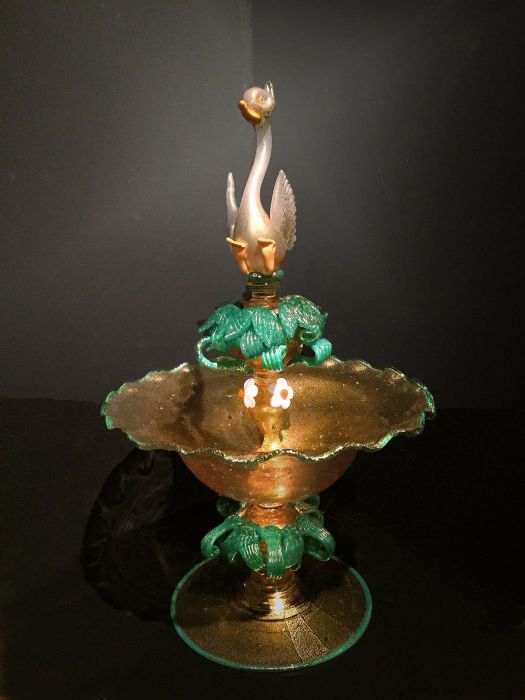 Raffinatissima e deliziosa piccola alzata che vuole rappresentare in miniatura una fontana con cigno, un gioco di abilità straordinaria dei maestri vetrai di Murano. Un capolavoro di maestria per stupire e sorprendere chi la vede.