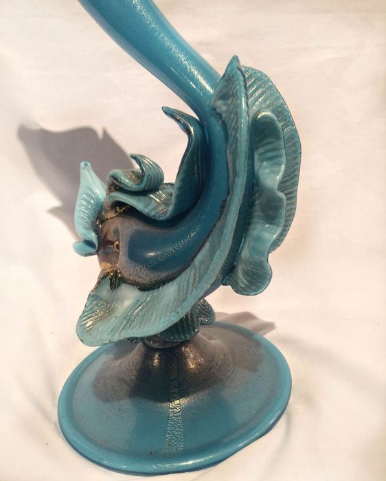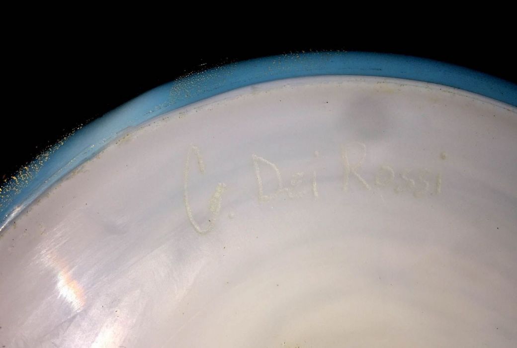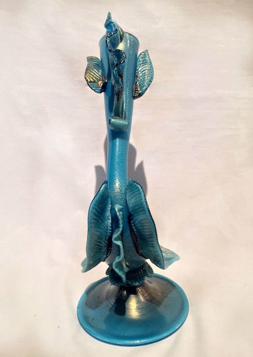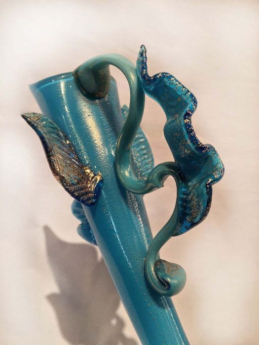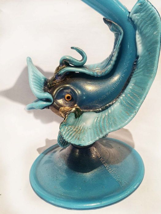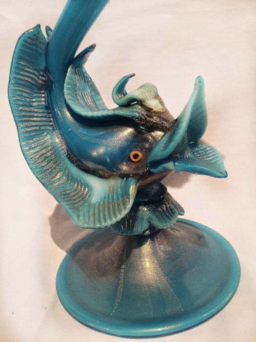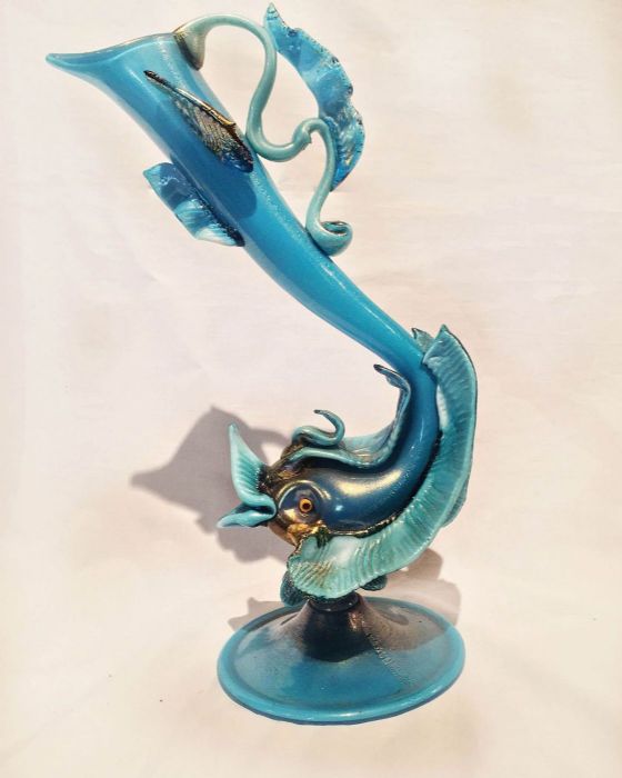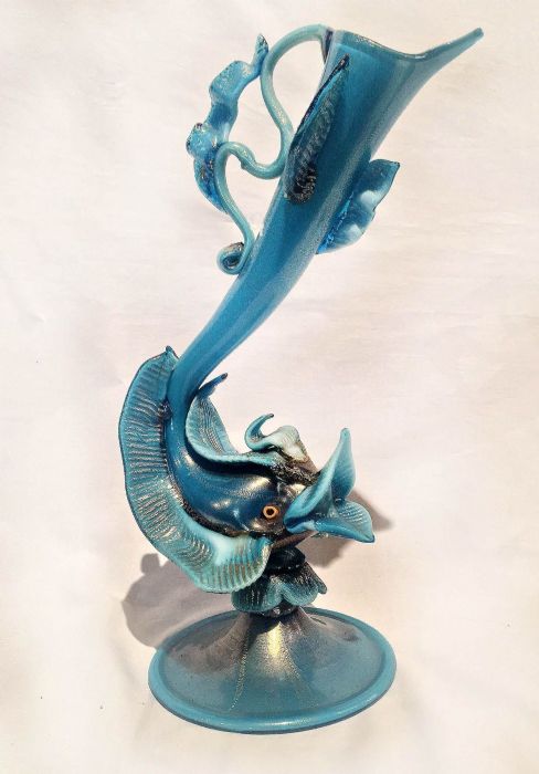 Fantasiosa "scultura – vaso" raffigurante un delfino mitologico eseguito in vetro lattimo, turchese e oro.