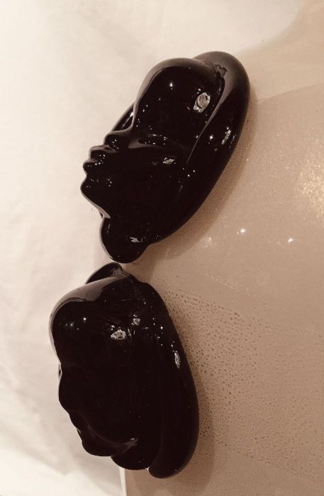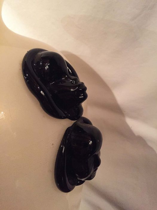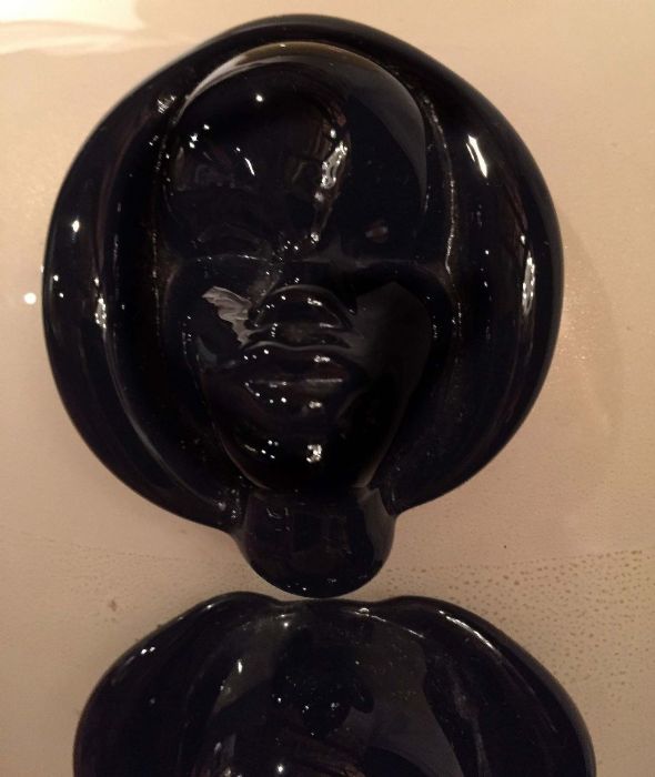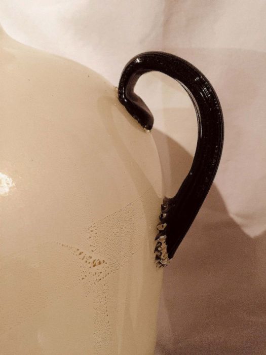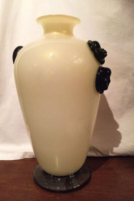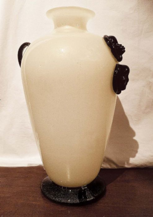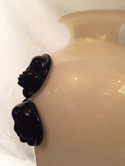 Elegante anfora in vetro "lattimo e oro" con lavorazione "a incalmo" e applicazione, a caldo, sulla sua parte superiore, di due ritratti di mori e del manico.