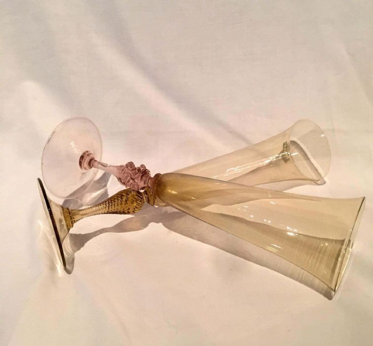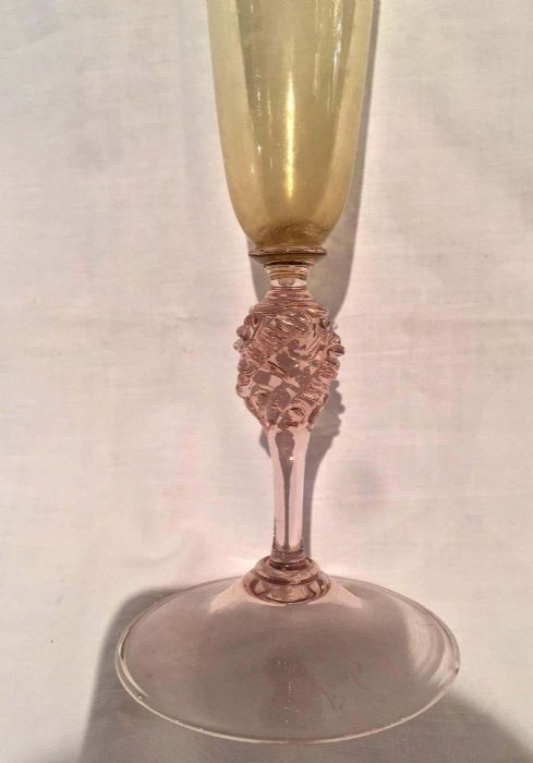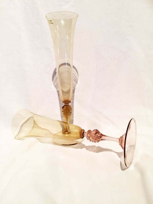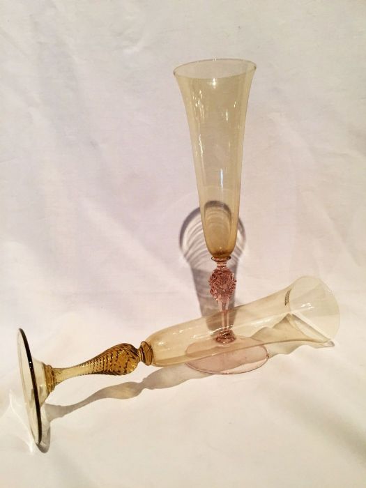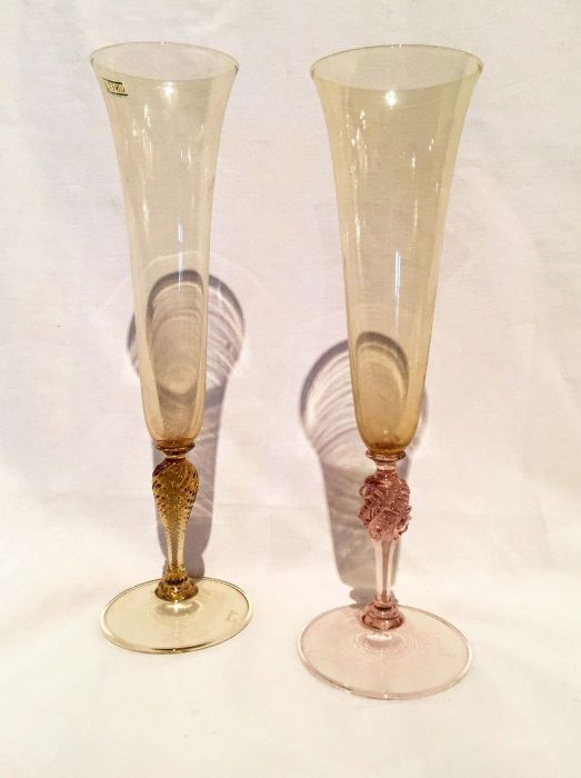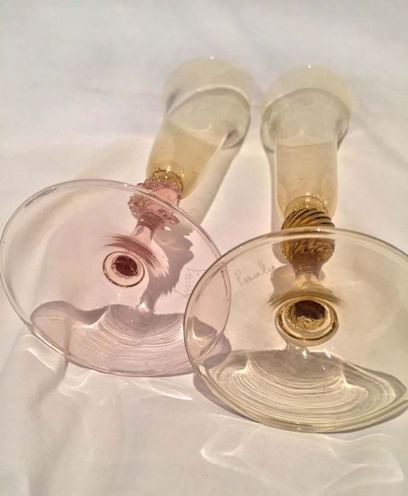 Due splendidi e delicati “flute” soffiati con raffinatezza dai maestri muranesi per la celebre manifattura Pauly .