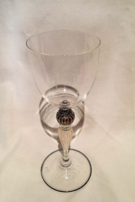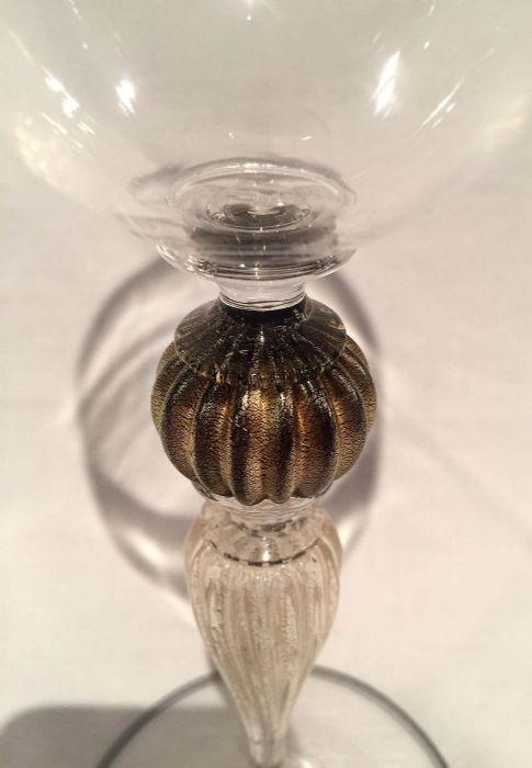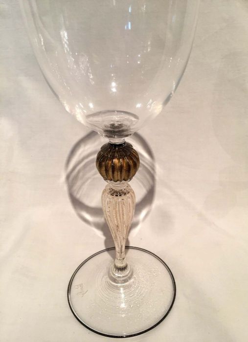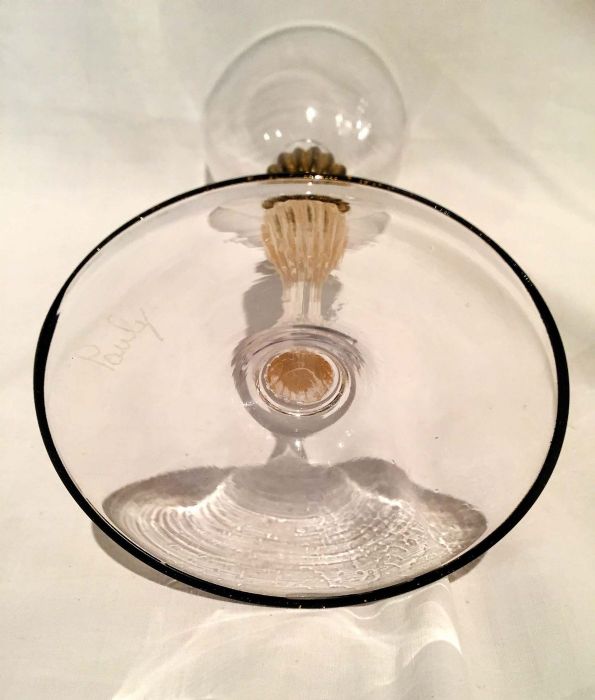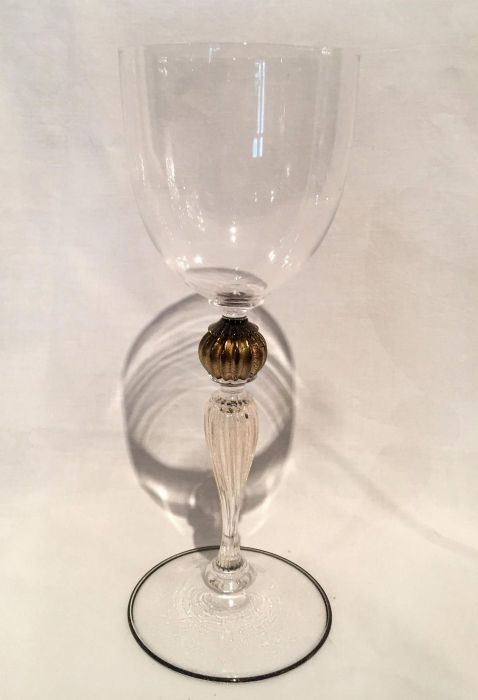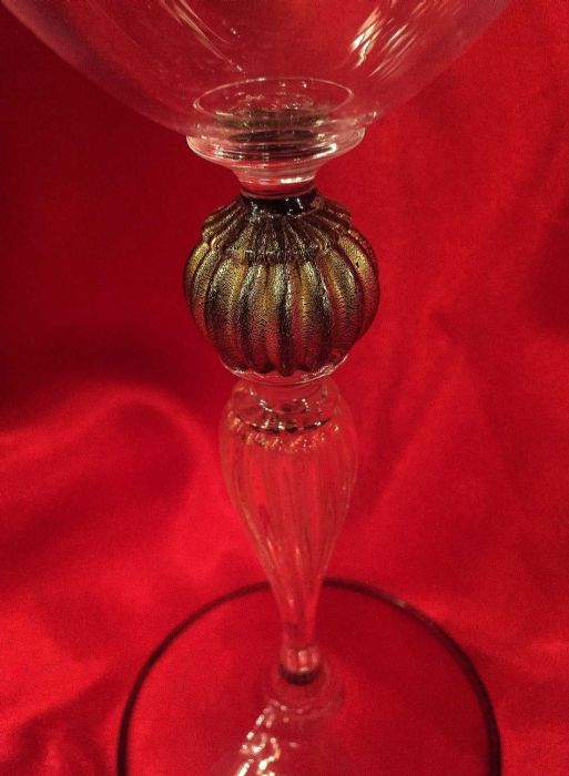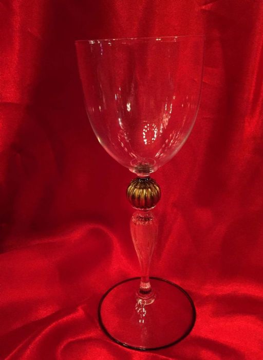 In vetro “cristallino” soffiato con abilità dai maestri di Murano per Pauly ed impreziosito da uno stelo elegantemente lavorato con all'nterno polvere d’oro, con “pomo” in oro antico. Il piede del calice, è rifinito con la particolare lavorazione a “filo” di color nero e oro.