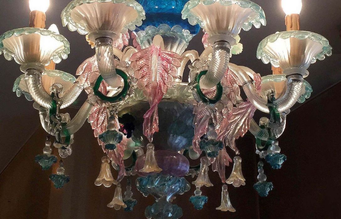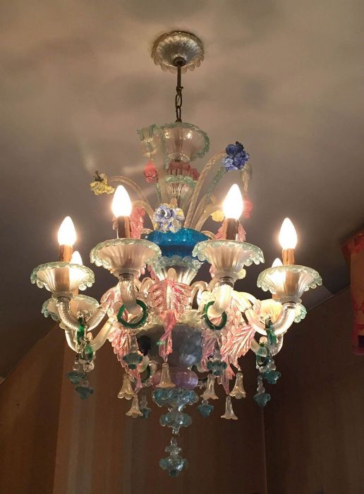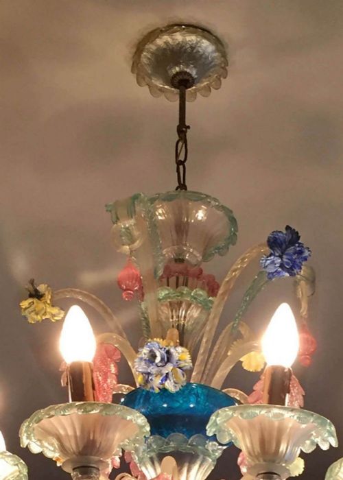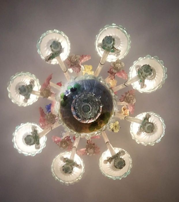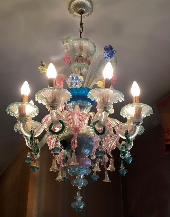 Delizioso esempio di antico lampadario in vetro di Murano policromo a 8 luci con cimiero.
