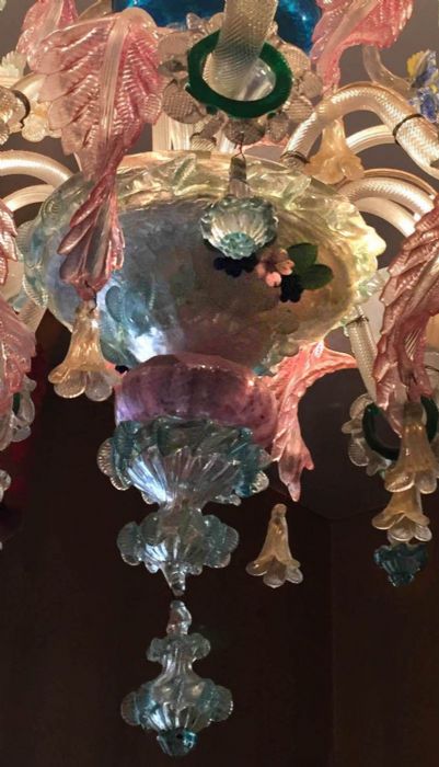 Bellissime policromie che si esprimono nella qualità davvero realistica dei fiori “taglientati” in pasta vitrea, foglie a “torchon” con campanule pendenti, bracci a “nucleo pieno” ai quali sono appesi anelli in policromia.