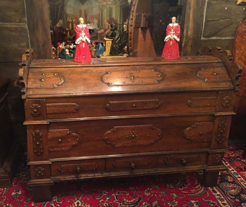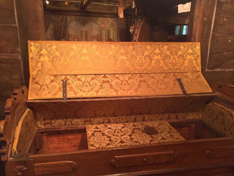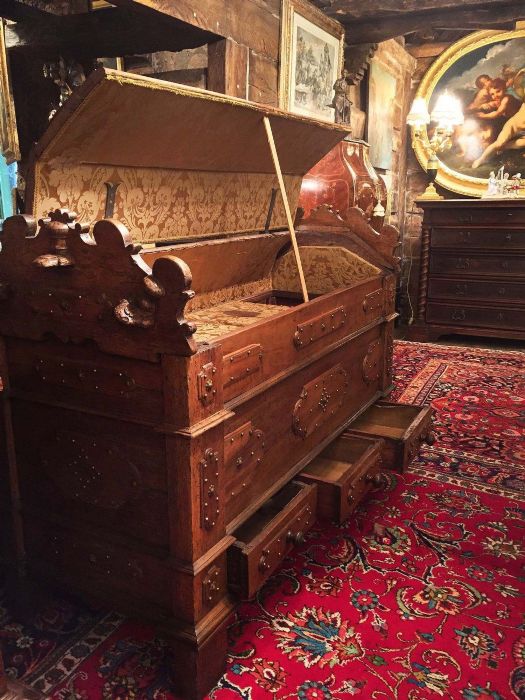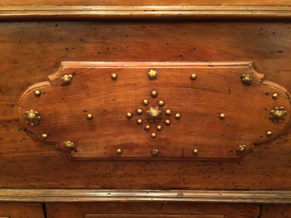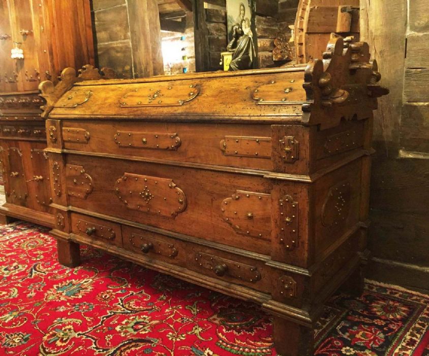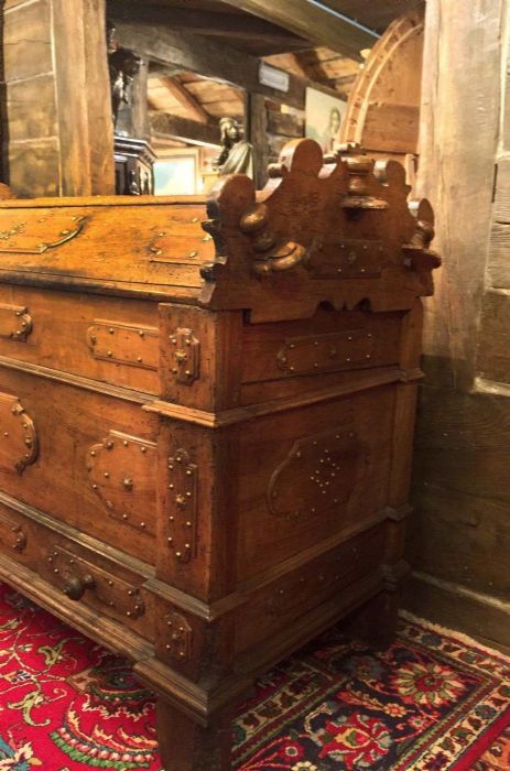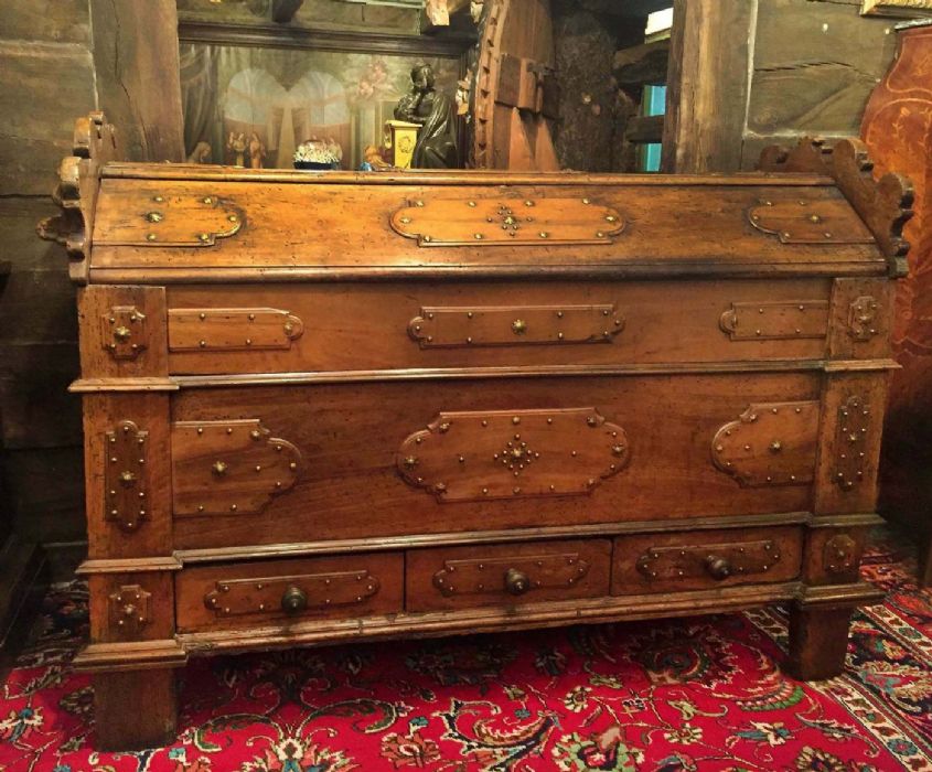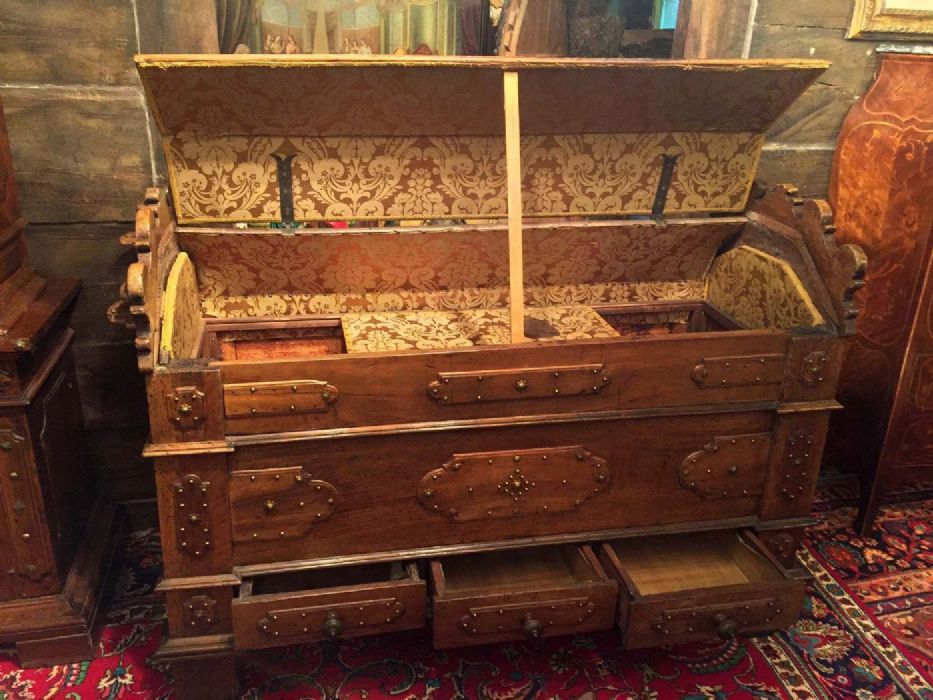 La parte superiore presenta la tipica forma detta “a schiena d’asino” o a doppio spiovente, derivante dalle sepolture gotiche ad arca o a sarcofago. Gli esemplari di maggior pregio come questo sono impreziositi da borchie in bronzo dorato che decorano le caratteristiche bugne. La ricercatezza del mobile è accentuata dalla presenza di tre cassetti inferiori e dalle cornici laterali prominenti verso l’alto, le quali, secondo tradizione, servivano per appendervi i finimenti dei cavalli. La tipica forma del coperchio veniva utilizzata anche per appoggiarvi le selle stesse dei cavalli.