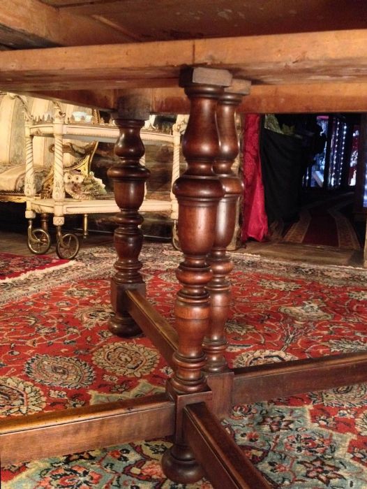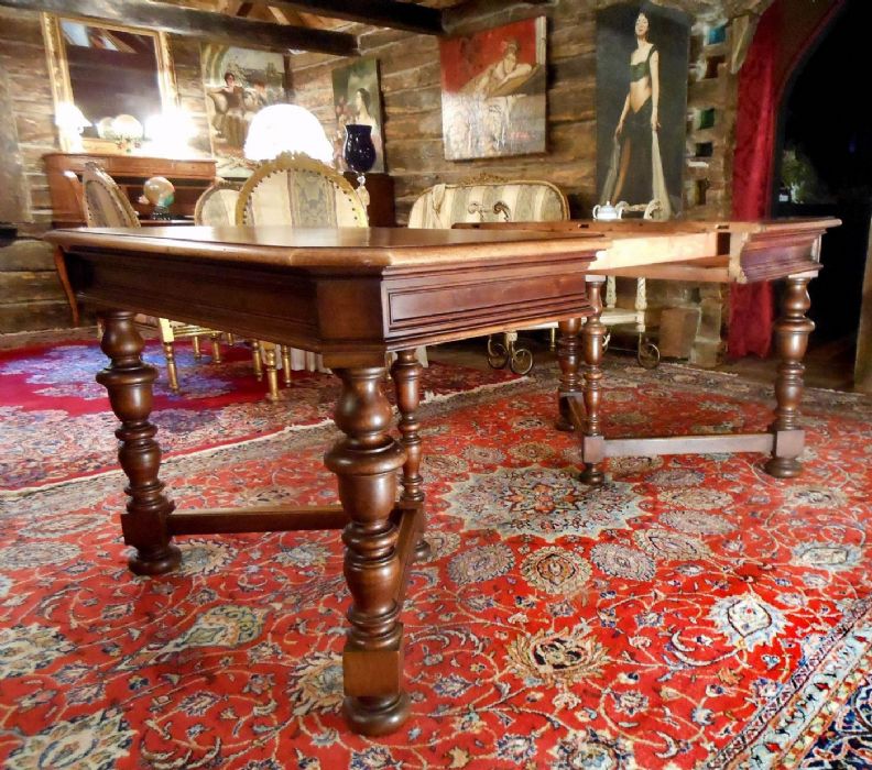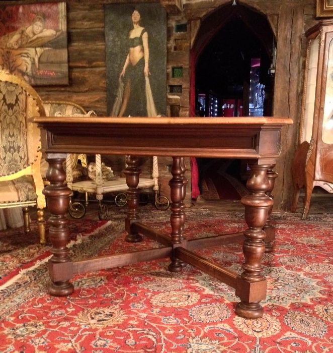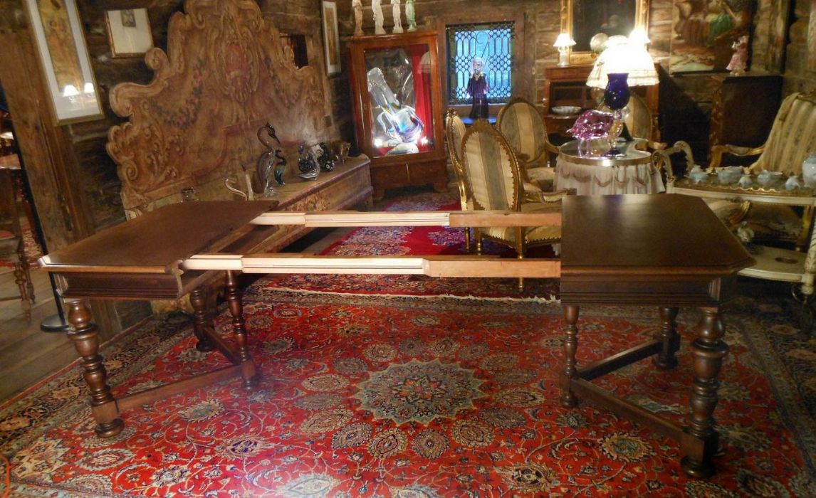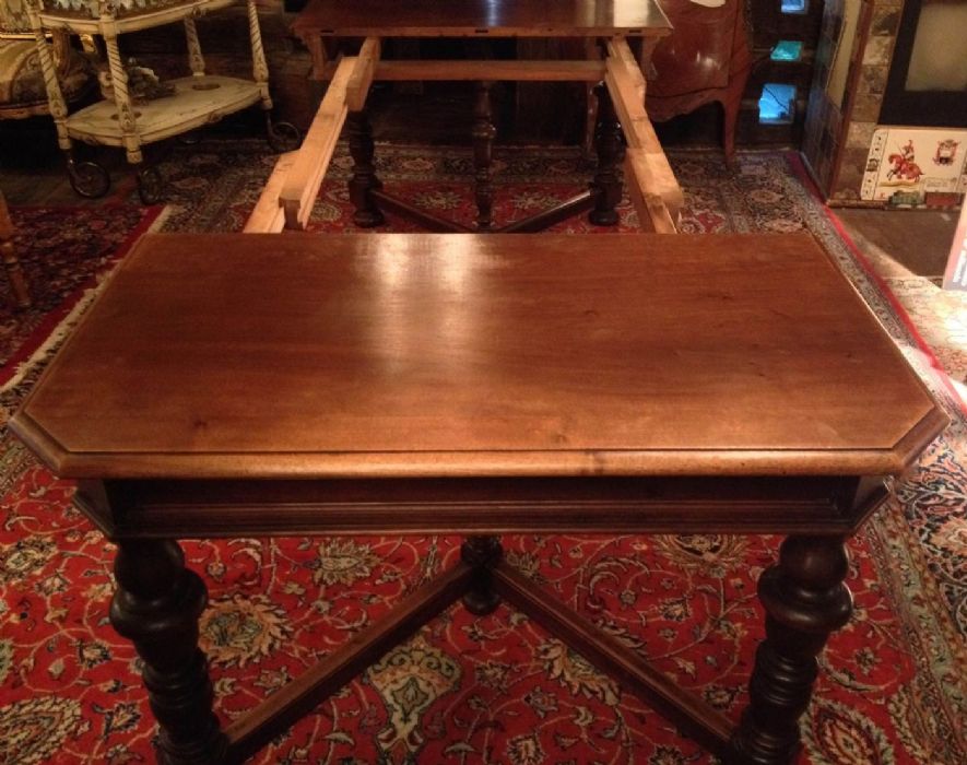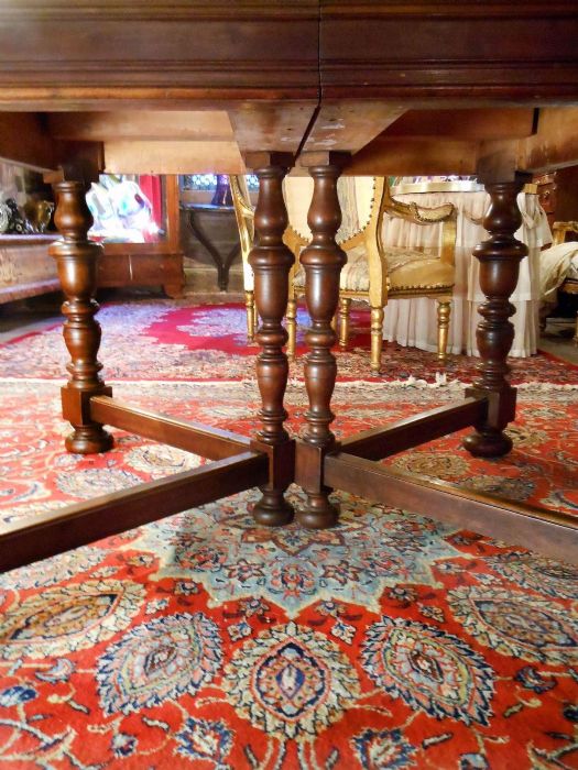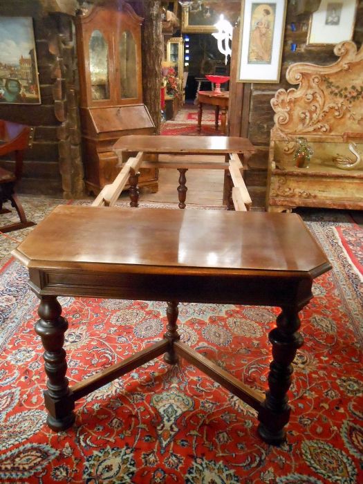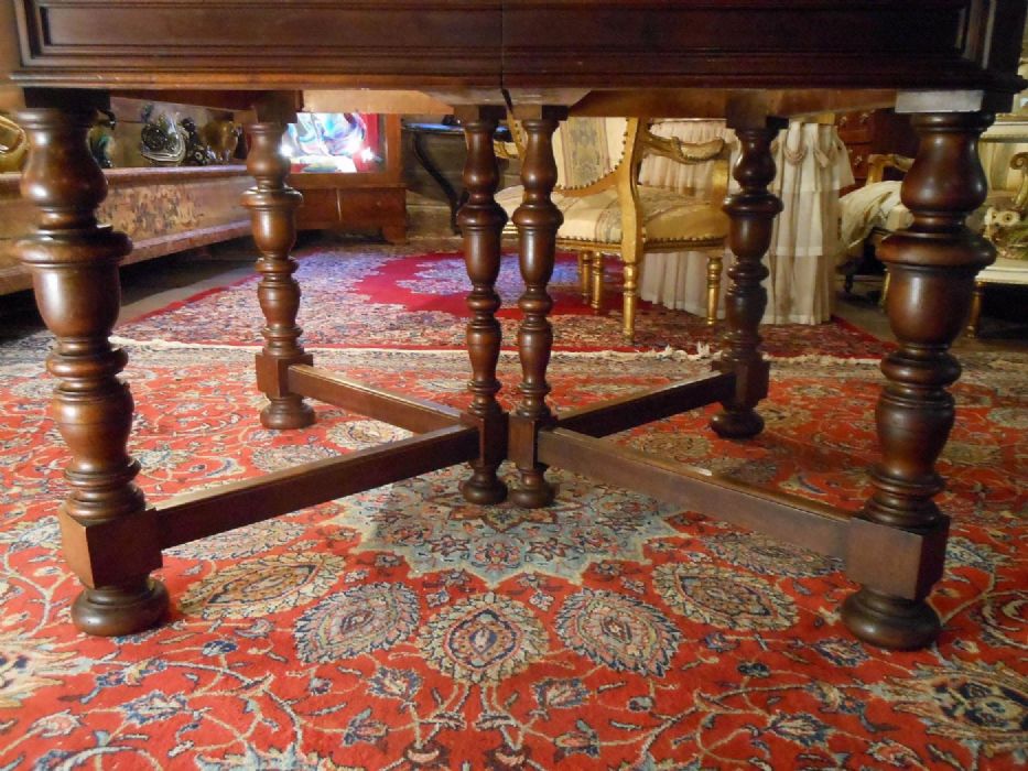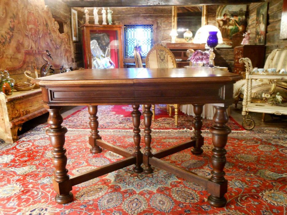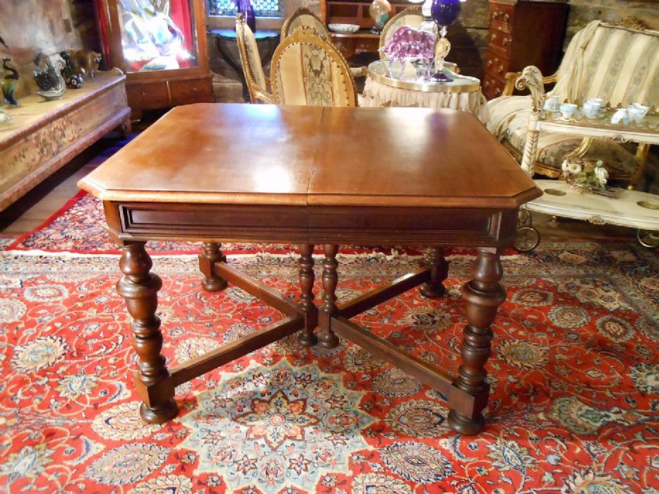 Elegante tavolo in noce massiccio di forma rettangolare allungabile fino a mt. 2,60 circa. Angoli smussati che rendono più elegante l'insieme. Piano originale di buon spessore con sottostante ampia cornice modanata. Piedi torniti secondo lo stile dell'epoca da cui si dipartono le stanghe che danno al tavolo, visto da chiuso, la caratteristica forma "a cancello".
