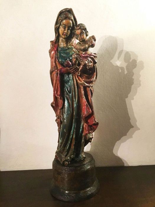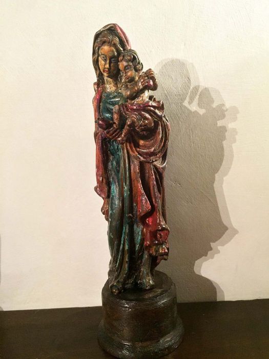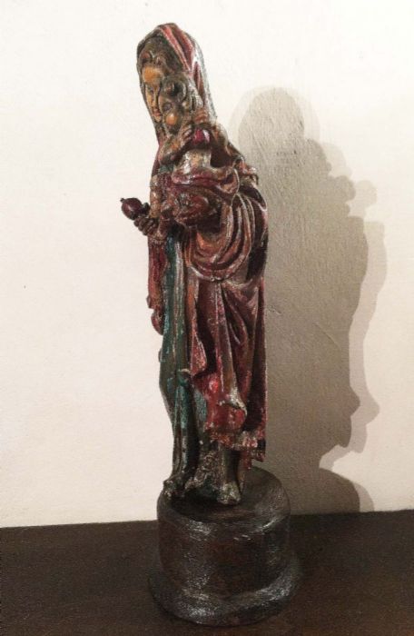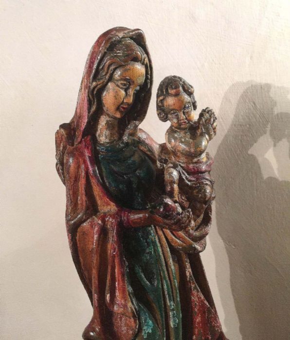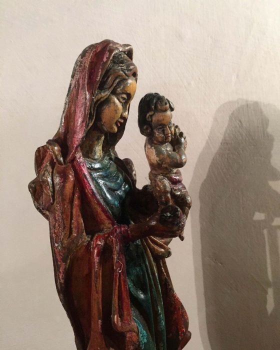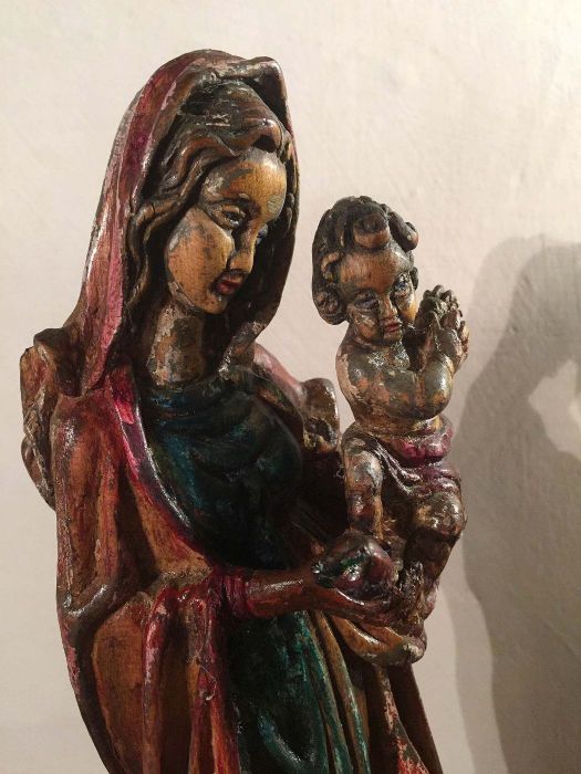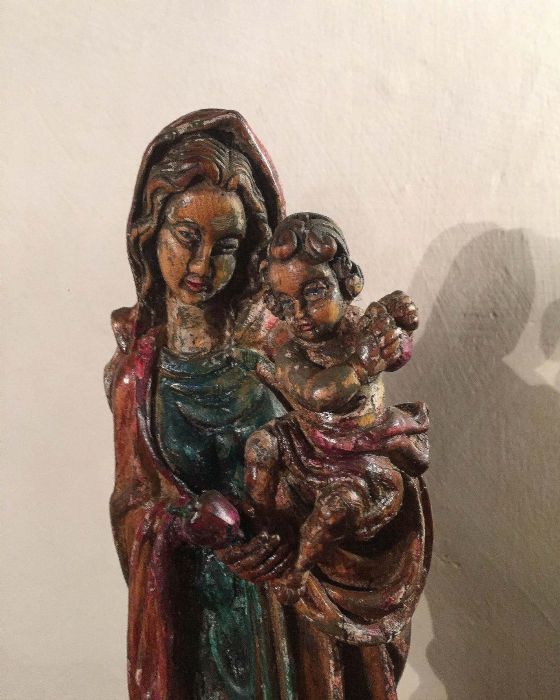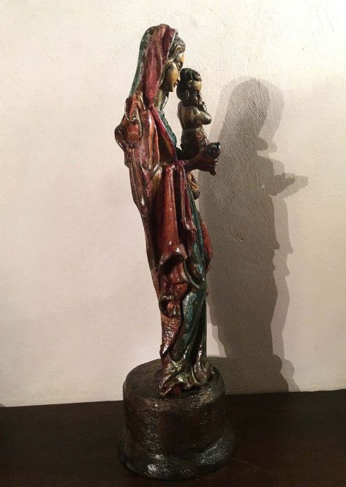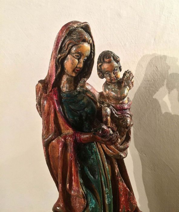 Bell'esempio di scultura lignea raffigurante una Madonna col Bambino Pantocratore con antiche policromie.