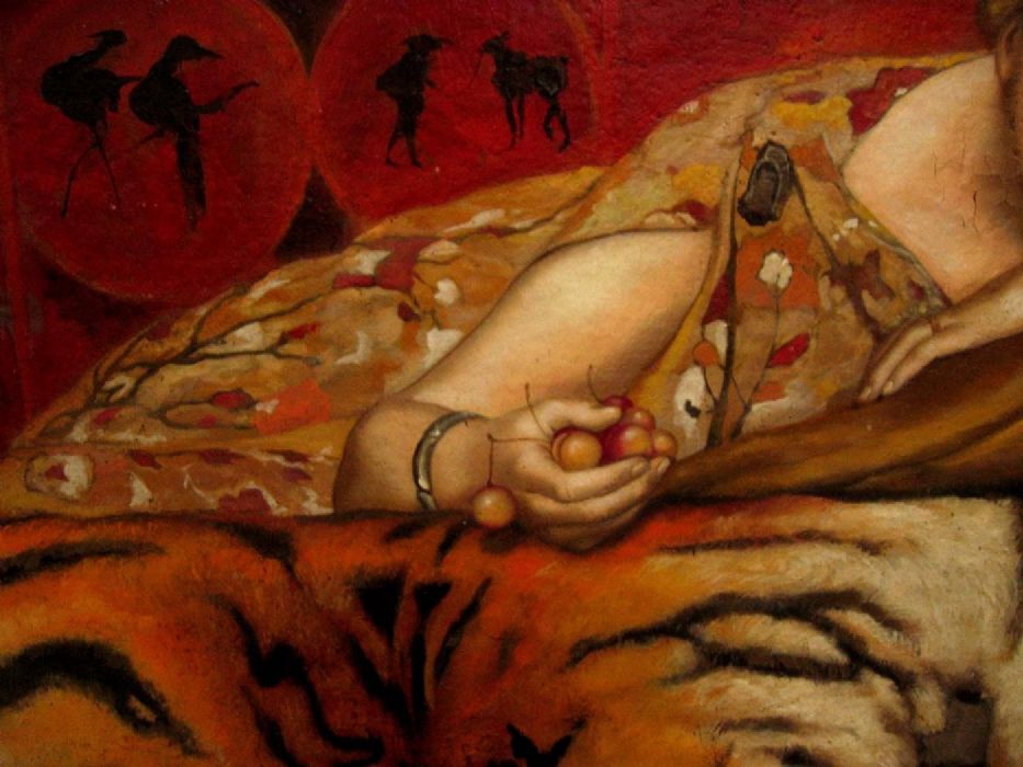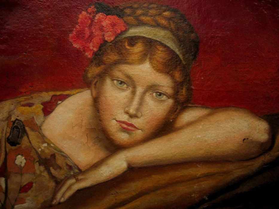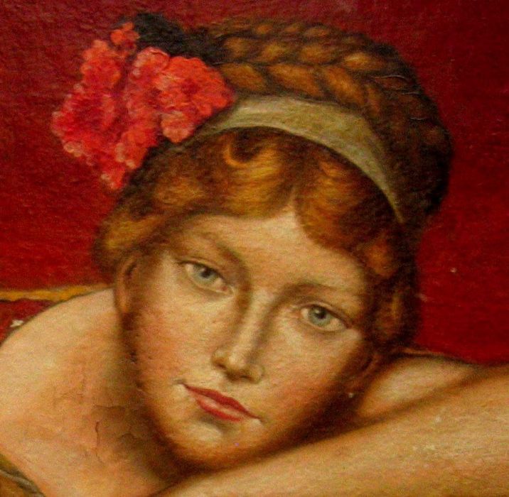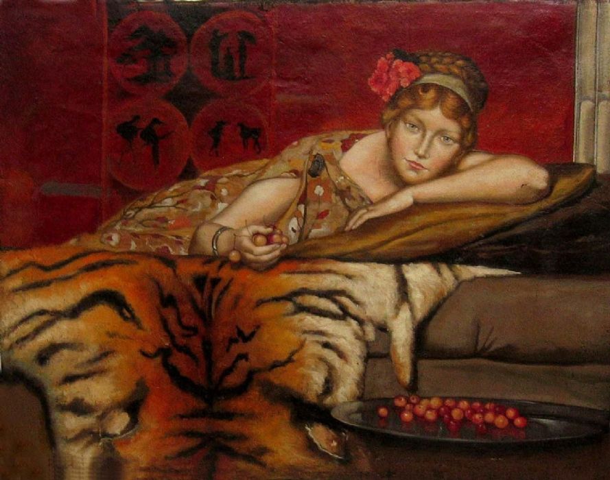 L’autore di questa opera (J.F.) si è ispirato con notevole qualità pittorica al famoso quadro di Alma Tadema dando una grande forza espressiva alla donna ritratta,sicuramente una sua modella. Il carattere fortemente innovativo della rappresentazione della figura femminile, legato all'epoca Futurista e dell" Arts and Crafts", è quì volutamente accentuato dal sapore languido e sensuale della scena. Gli occhi della dama seguono costantemente ed in ogni direzione l'osservatore, quasi a volerlo ammaliare. Anche l'insieme dell'ambiente con lacche cinesi rosse particolareggiate, pelle di tigre, su cui la donna è mollemente adagiata, l'abito largo di seta che scopre le braccia, contribuisce a rendere l'atmosfera sottilmente provocante. Opera monogrammata e datata "J. F. 29", presumibili iniziali dell'artista (ed anno di realizzazione del quadro).