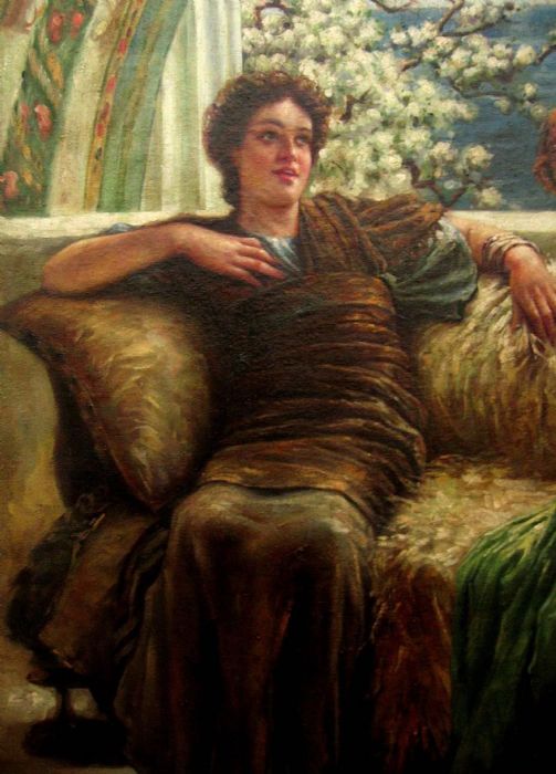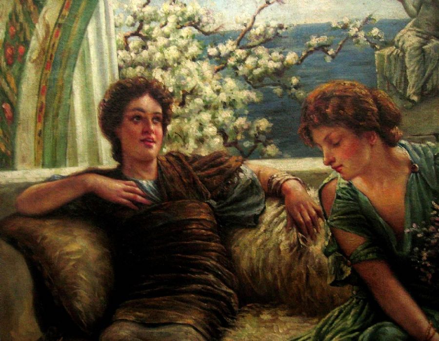 Raffinato dipinto che si rifà al quadro di Sir Alma Tadema raffigurante un incontro fra amiche all'interno di un elegante patio pompeiano affacciato sul mare. Le due fanciulle sono abbigliate con "pepli alla romana ", ai loro piedi una pelle di tigre che sottolinea l'atmosfera giovanile e scapigliata della scena. Alle spalle delle due protagoniste si nota un bel gruppo scultoreo, anch'esso al femminile, che ritrae due donne intente a confidarsi.