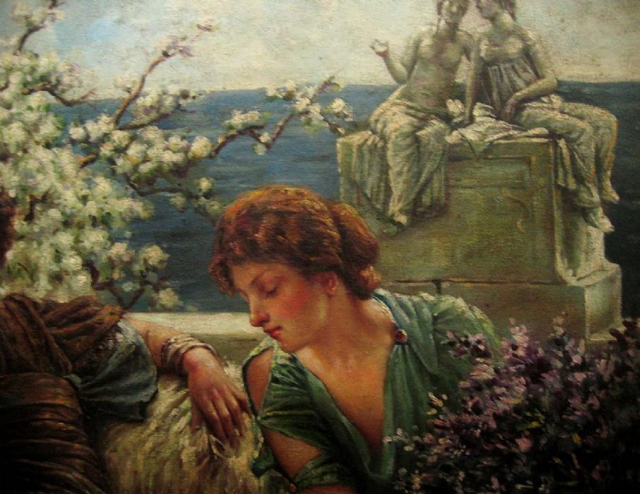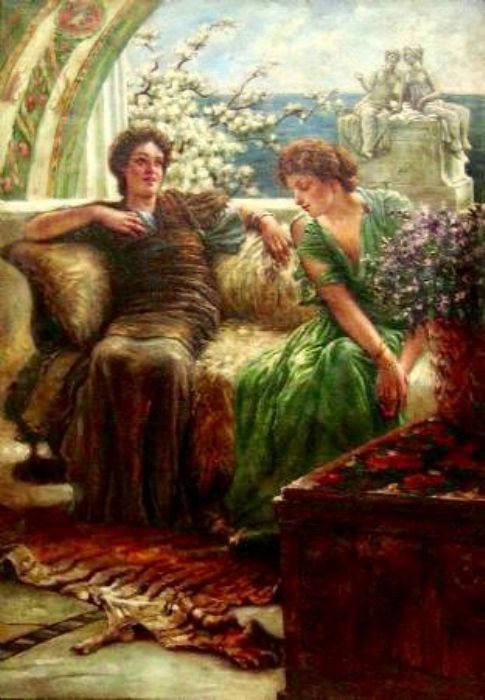 Raffinato dipinto che si rifà al quadro di Sir Alma Tadema raffigurante un incontro fra amiche all'interno di un elegante patio pompeiano affacciato sul mare. Le due fanciulle sono abbigliate con "pepli alla romana ", ai loro piedi una pelle di tigre che sottolinea l'atmosfera giovanile e scapigliata della scena. Alle spalle delle due protagoniste si nota un bel gruppo scultoreo, anch'esso al femminile, che ritrae due donne intente a confidarsi.