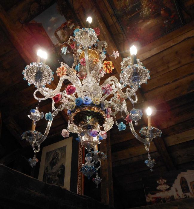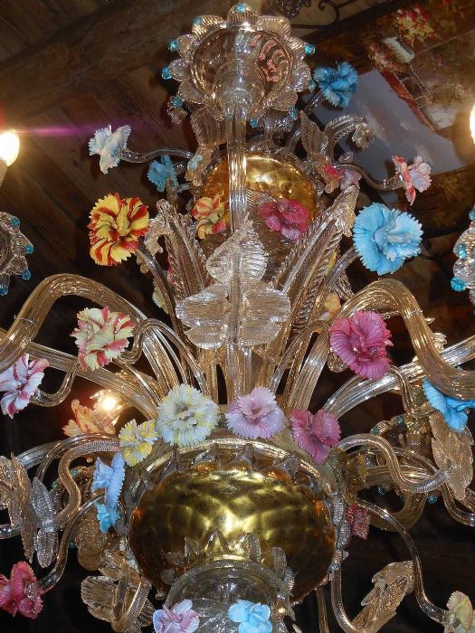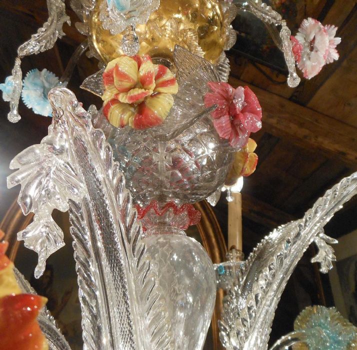 Raffinato lampadario policromo di Murano a fuso con dieci braccia (5+5). Due piani sfalsati, vivaci fiori in pasta di vetro policromi, tirati a pinza e “taglientati”. Due cimieri, numerosi pendenti a goccia con piccoli fiori. Un vero gioiello dell’arte vetraria veneziana risalente al primo decennio del Novecento. Le sue equilibrate proporzioni, i bracci sfalsati, il realismo dei fiori e dei colori, lo rendono ricco, elegante e slanciato. Il punto luce ideale per una bella camera da pranzo e un elegante sala.