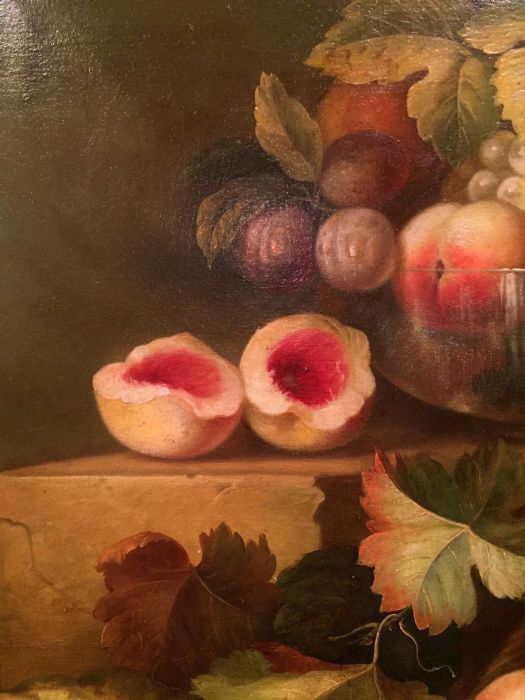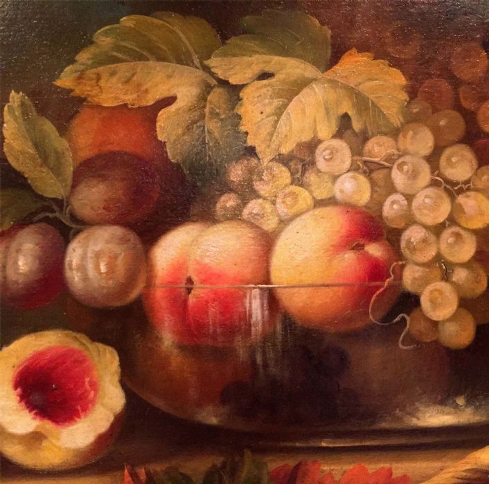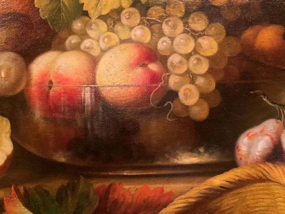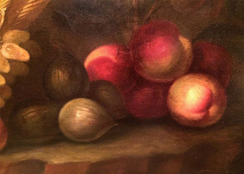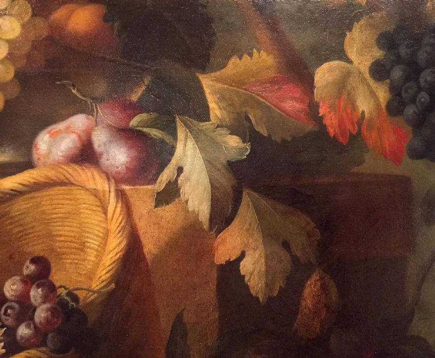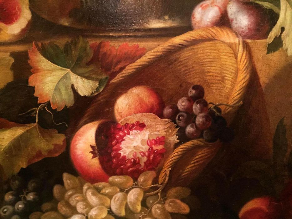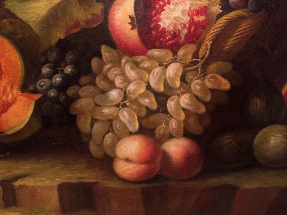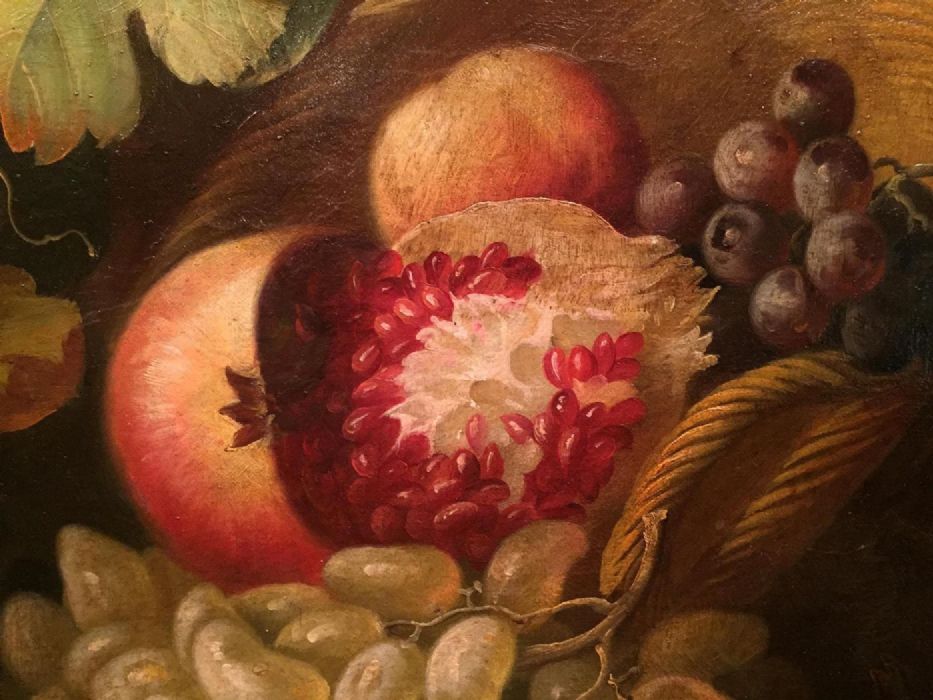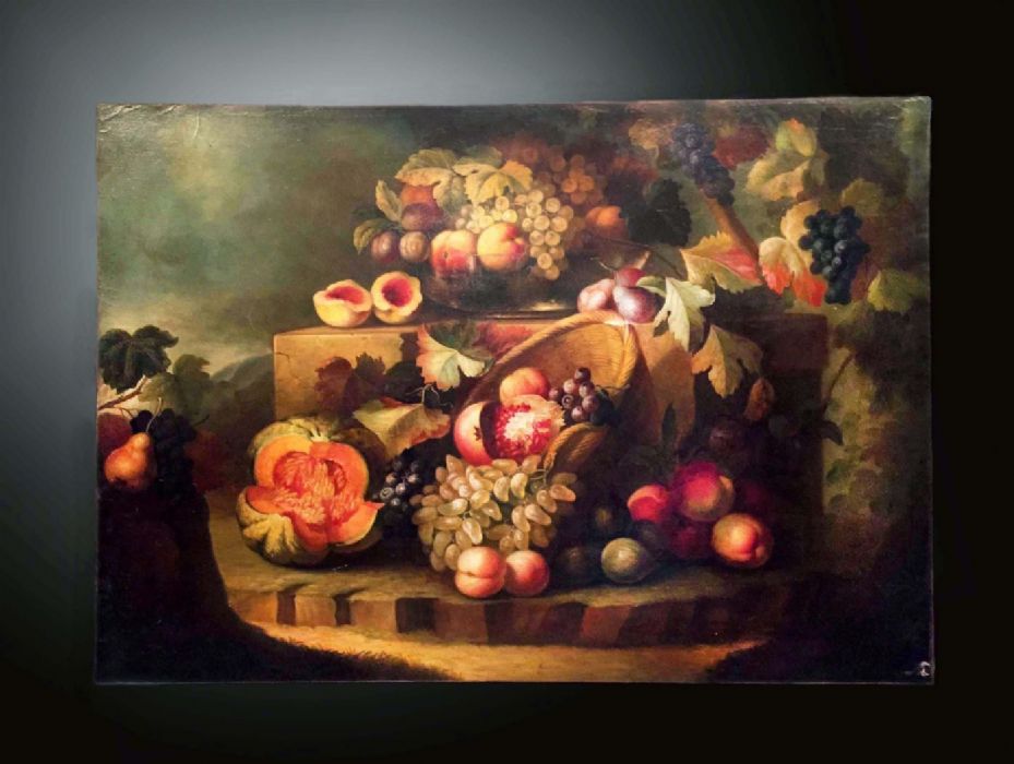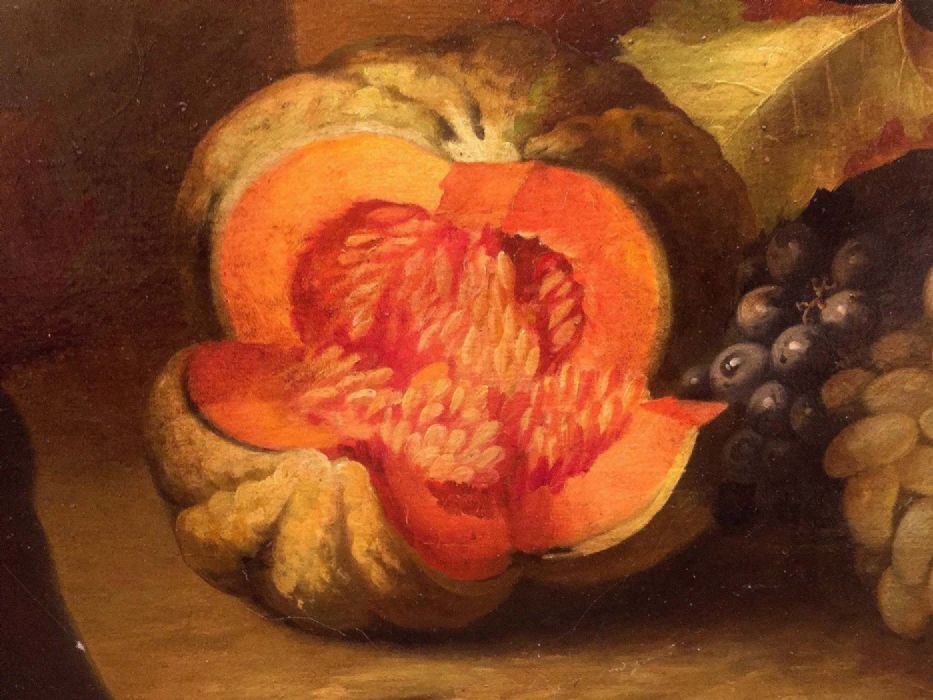Un quadro ricco nella composita natura morta con corbeille di frutta fresca del primo autunno. Una vera e propria composizione arricchita con diverse uve da tavola nere e bianche fra le quali si riconosce la varietà “Pizzuttella”, tipica del centro e sud Italia, uva “Regina” di antica origine, prugne, uva Spina, pere, mele e, dentro al cesto appoggiato all’architettura, un bene augurante melograno aperto con i suoi bellissimi semi rossi. In primo piano attrae l’attenzione una zucca aperta dal suggestivo e tipico colore arancione.