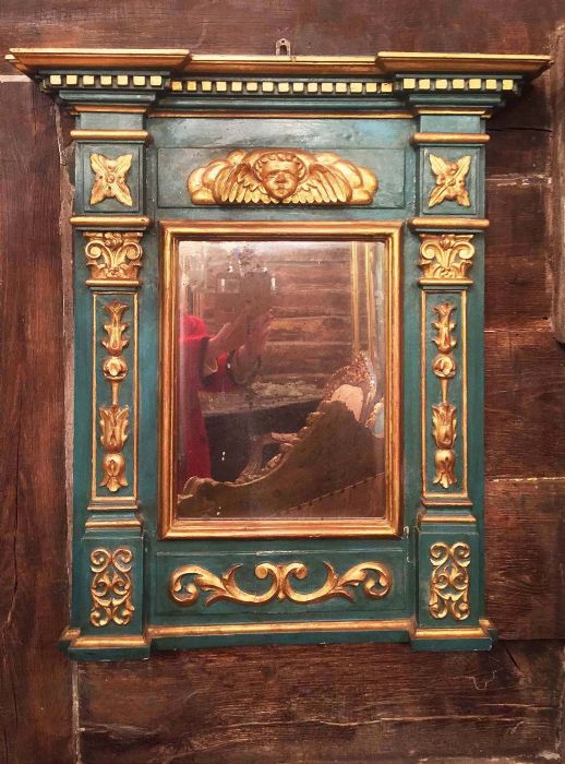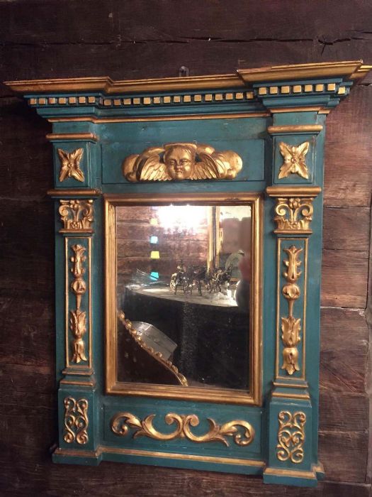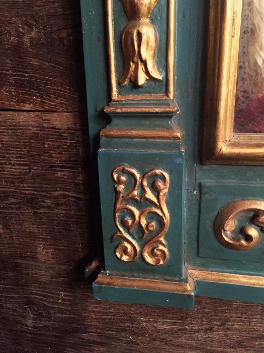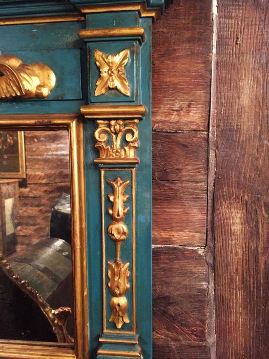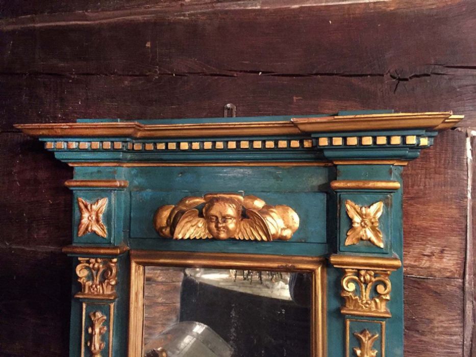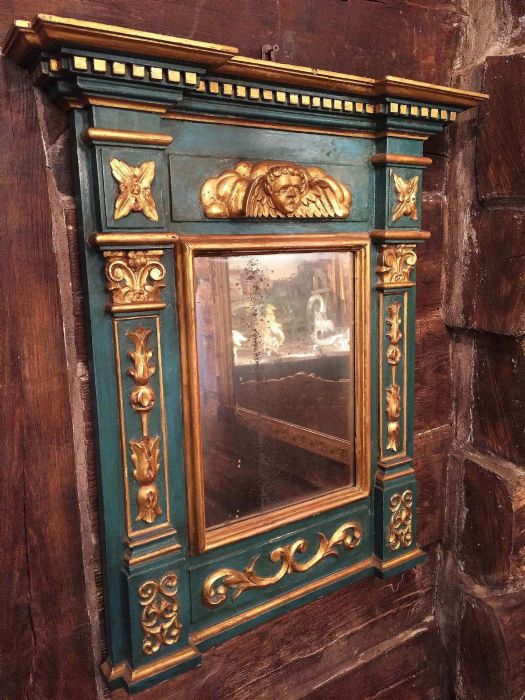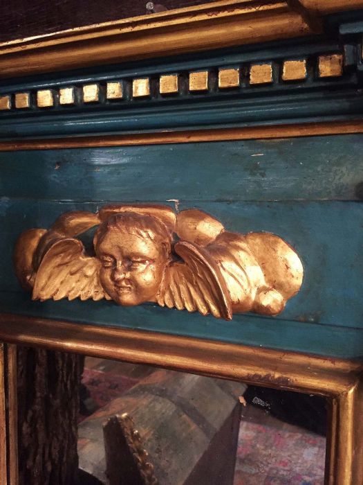 Interessante e deliziosa coppia di specchiere-caminiere anche da appoggio in legno dipinto e laccato su tonalità del verde mare. Presenza di cimasa dorata aggettante, greche, putti, capitelli, racemi e decori intagliati e scolpiti di color oro. Specchi originali al mercurio.