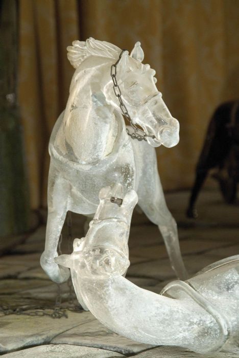 quadriga al centro (cavalli caduti nella polvere durante la gara e del loro conduttore) lavorazione "a scavo, a ghiaccio e opalino" con passaggio a caldo in polvere di vetro (effetto "sabbia");
