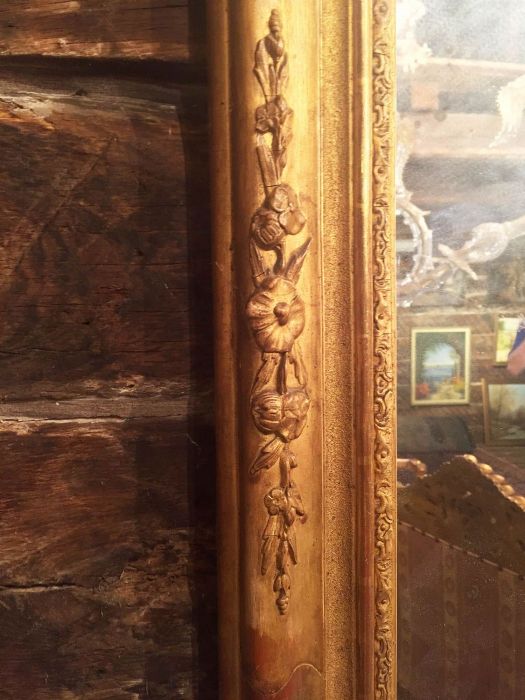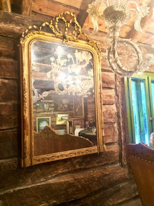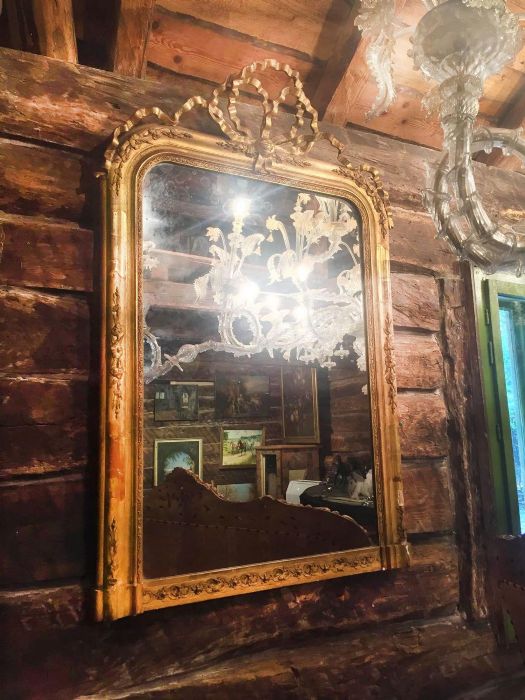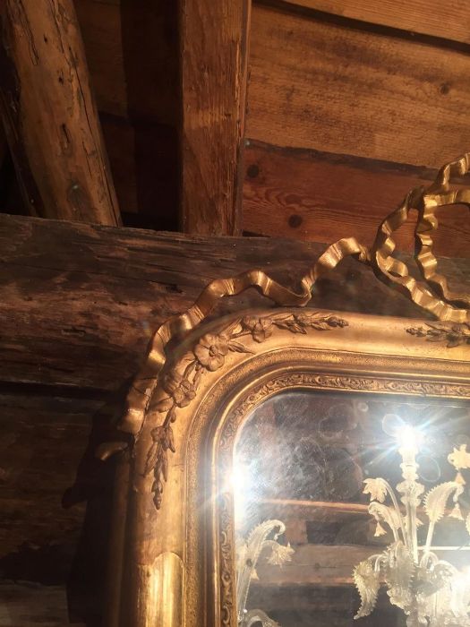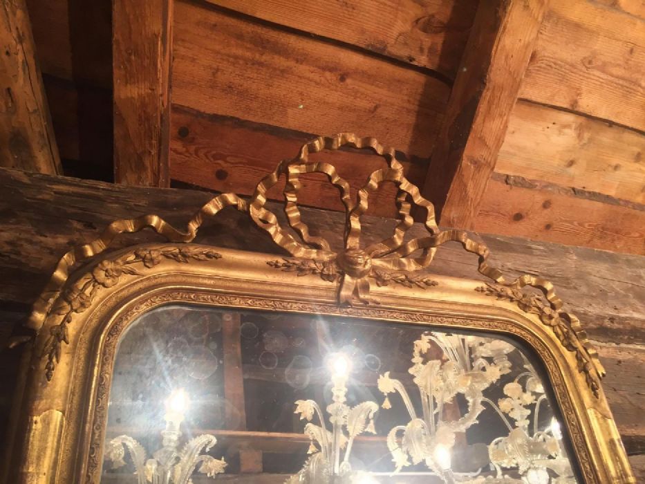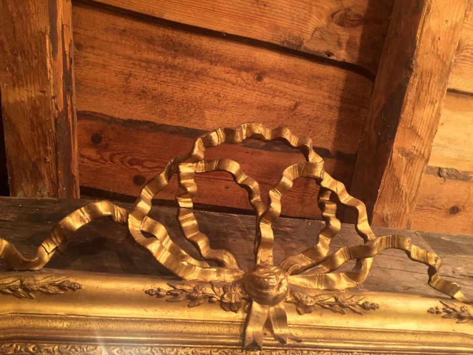 Elegante e ben conservata specchiera – caminiera del periodo Luigi Filippo (1840 – 1850) in legno dorato ed intagliato. Cimasa con intagli “a nastro” raffiguranti “nodo d’amore”. Questi particolari manufatti venivano commissionati e poi regalati ai novelli sposi per adornare i loro salotti (posizionandoli sopra un camino) o le camere da letto.