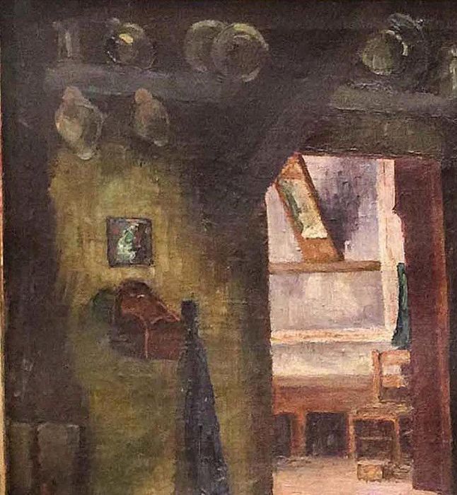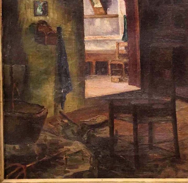 Lo scorcio, illuminato dalla luce del giorno, probabilmente era l’ingresso della casa rurale dove ci si toglievano gli indumenti del lavoro e li si appoggiava sulla panca, ci si “riordinava“ davanti allo specchio, prima di entrare in cucina.